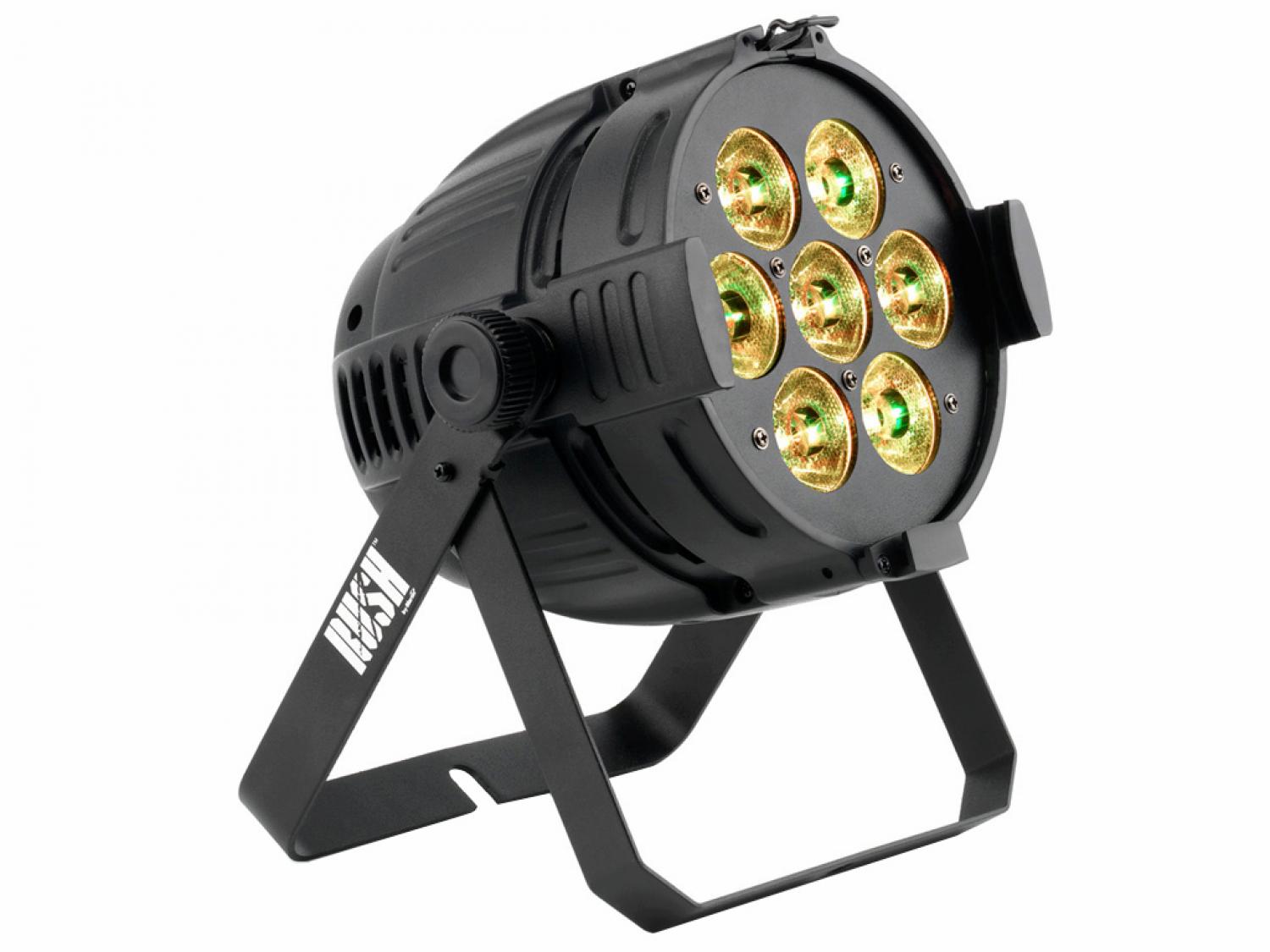 Il RUSH PAR 1 RGBW è un PAR luminoso a LED con mixaggio dei colori RGBW premiscelato. Dispone di dimmer elettronico e strobo e viene fornito con una staffa per montaggio su pavimento o truss.
