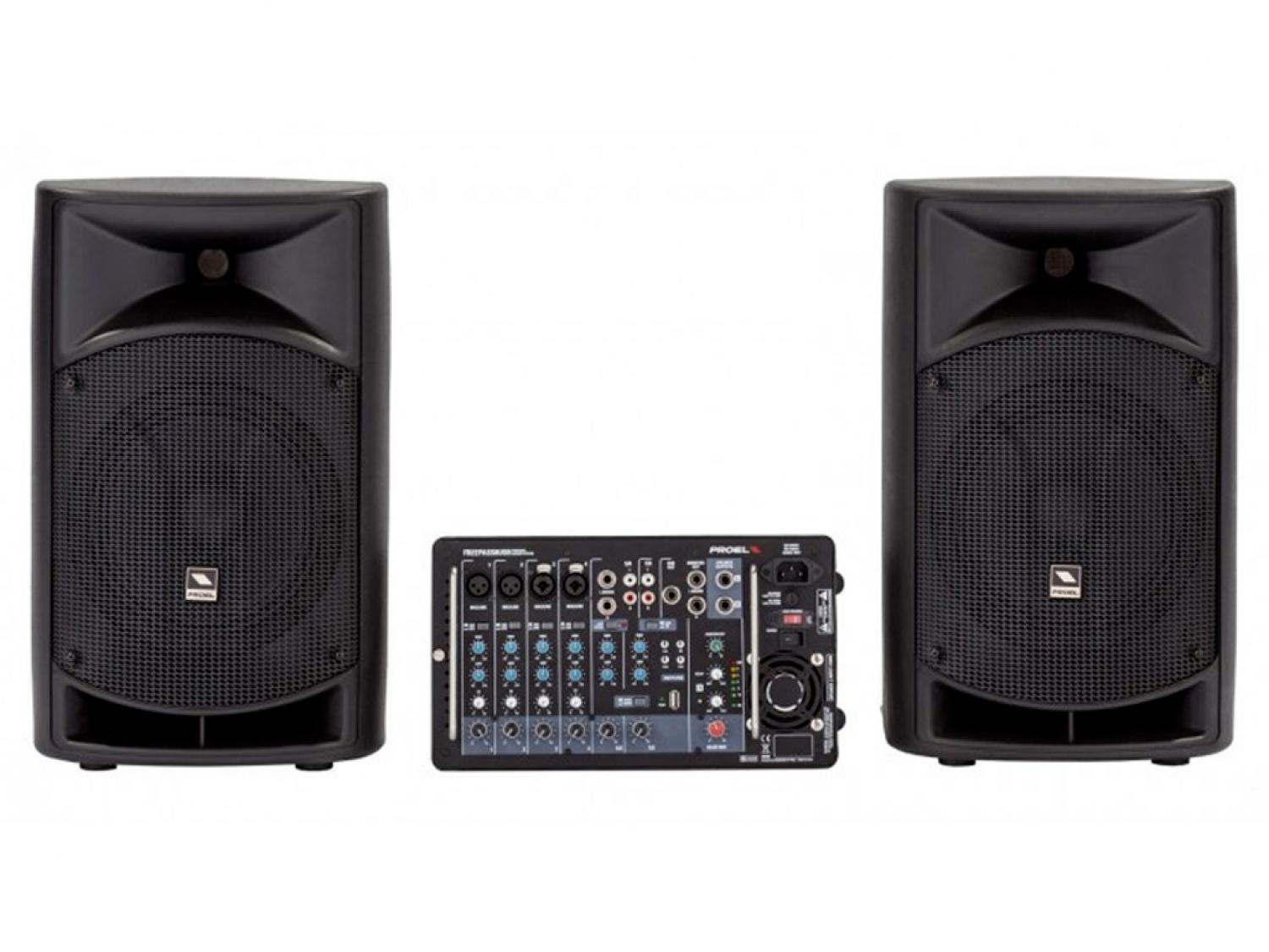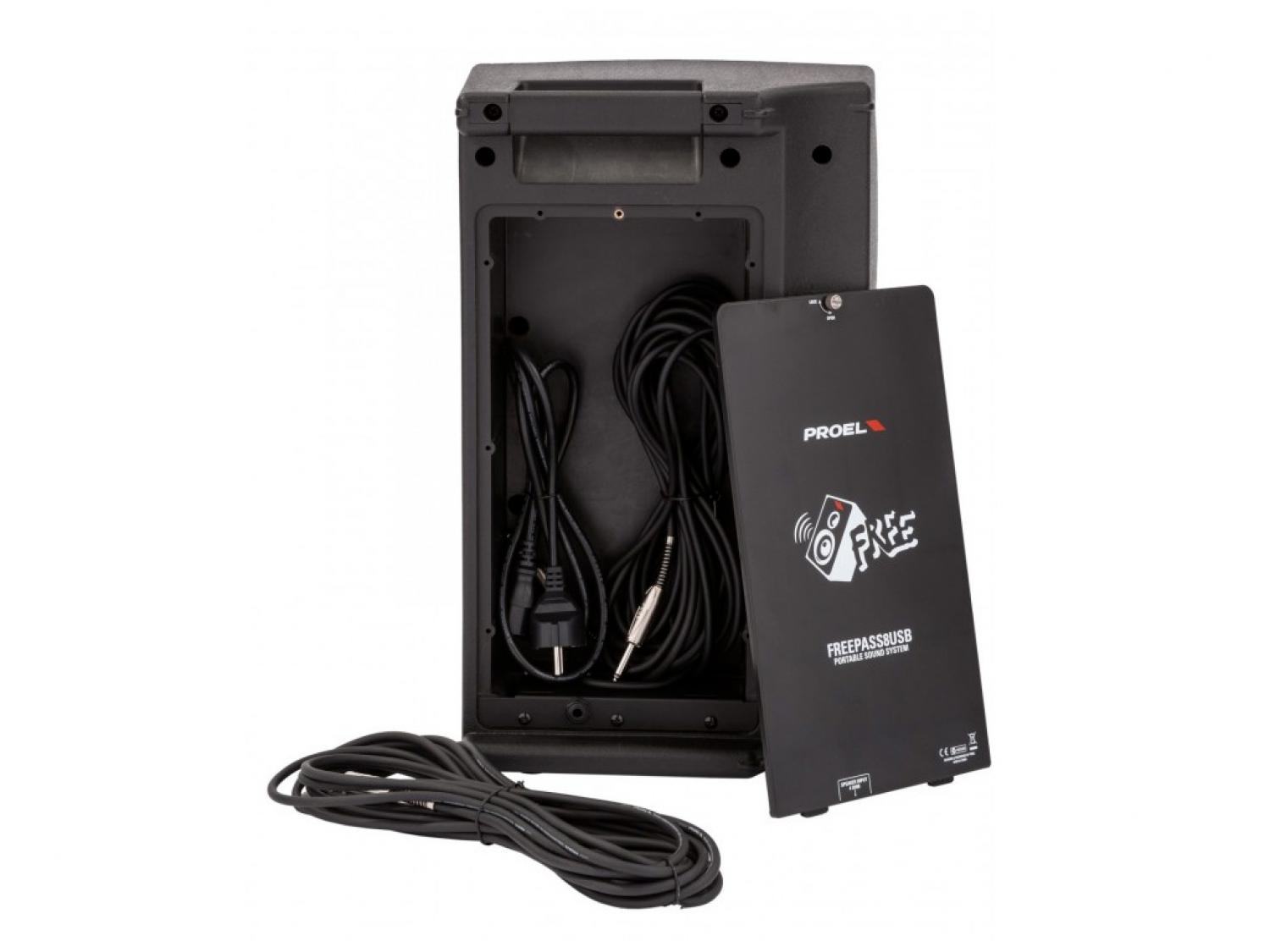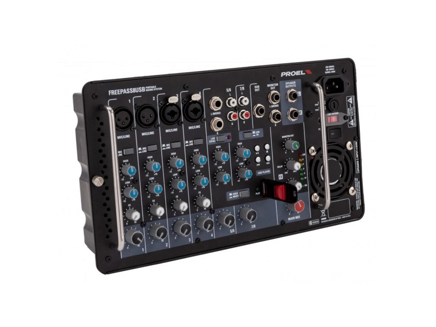 Freepass 8 USB è un sistema audio completo che unisce, in un formato estremamente compatto e portatile, tutto ciò di cui il musicista o l'utente necessitano: un mixer completo, un versatile lettore MP3, un potente amplificatore, due diffusori a due vie e i cavi di collegamento. Benché di dimensioni ultra-compatte, veloce da allestire e facile da utilizzare, il Freepass 8 USB offre un set completo di funzioni ed una qualità sonora sorprendente per sistemi audio di questo tipo. Il mixer 8 canali, amplificato con 2x 250 Watt e dotato di connettore USB per la riproduzione di file MP3, è alloggiato nel vano posteriore di uno dei due diffusori e può essere facilmente rimosso per un classico utilizzo desktop. L'altro diffusore include un capiente scomparto che può contenere i cavi di connessione ad altri accessori. I due cavi Proel di alta qualità forniti con il sistema sono dotati di robusti connettori a jack in metallo. I diffusori in polipropilene a due vie con driver a compressione da 1,35" a tromba e woofer da 8" offrono un suono full-range definito e nitido oltre ad un elevato livello di pressione sonora. Una comoda maniglia sul lato superiore e l'alloggiamento per il supporto agevolano trasporto ed installazione. Grazie alla portabilità ed alla versatilità il FREEPASS10USB può essere utilizzato in una moltitudine di applicazioni, come esibizioni dal vivo di cantanti o piccoli gruppi, eventi sportivi o didattici e presentazioni di vario genere.