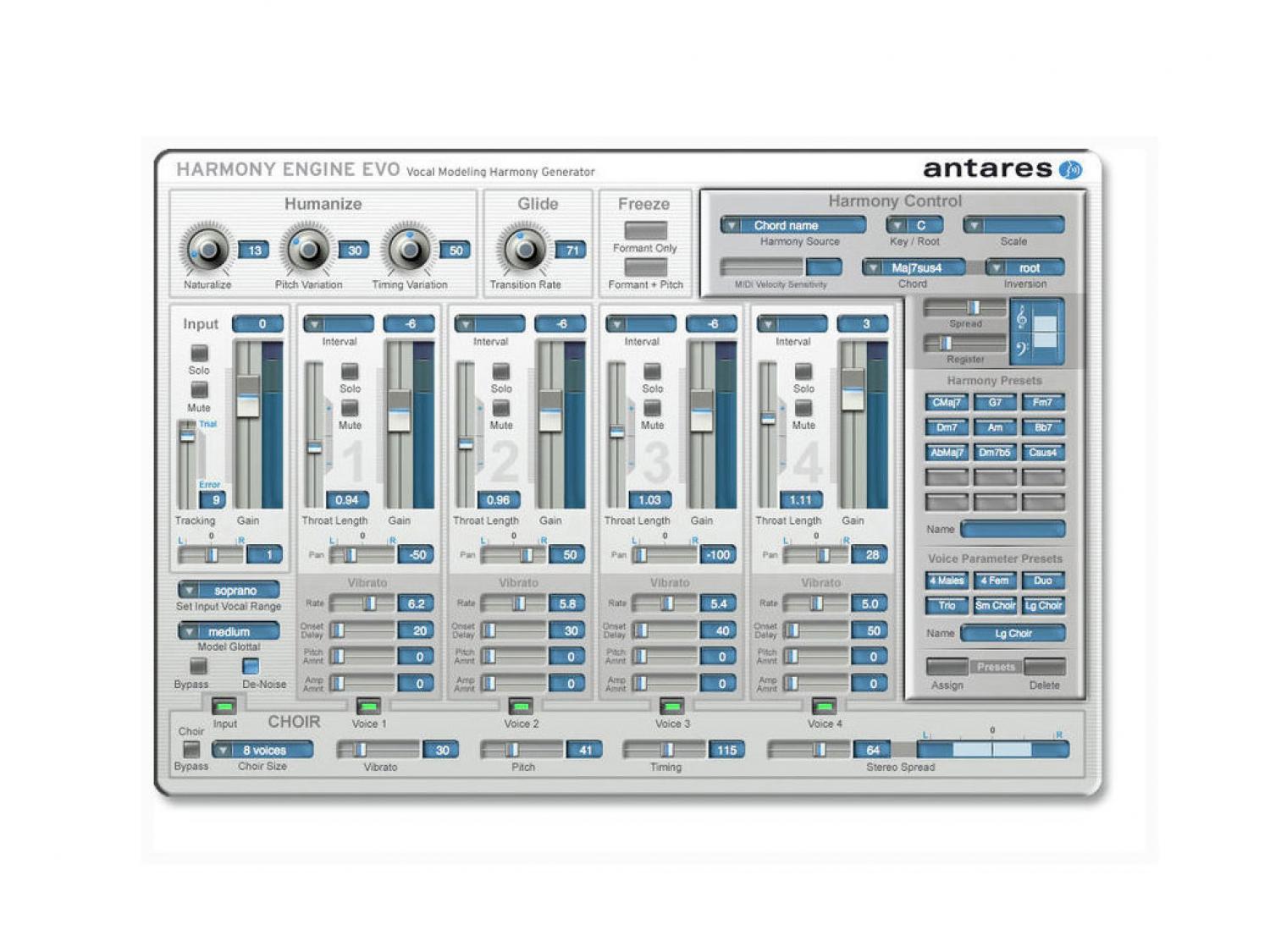 • CHOIR Evo Vocal Multiplier - trasforma una singola voce in un massimo di 32 distinte voci singole all'unisono; assegna le istanze di CHOIR alle voci che cantano l'armonia ed ecco immediatamente il coro