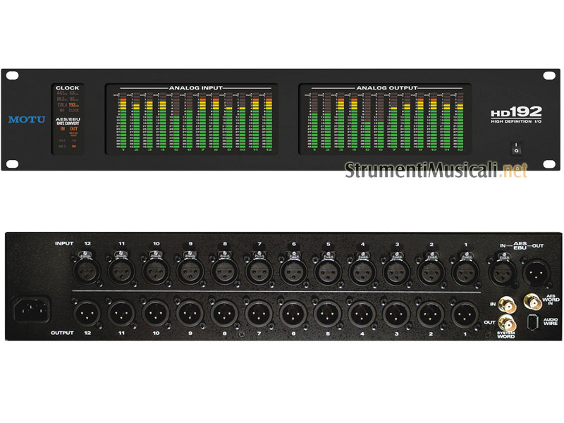La MOTU HD192 è un'interfacia audio ad altissima qualità e definizione studiata per chi pretende e richiede il massimo della qualità che la tecnologia offre. E' dotata dell'ultima generazione di convertitori a 24bit e frequenza di campionamento 192kHz; la HD192 ha un range dinamico di 120db. Come gli altri sistemi basati sulla scheda PCI-424 (24I/O e 2408mk3), anche HD192 consente di gestire più interfacce contemporaneamente permettendo di avere sino a 48 canali simultanei di I/O analogici a 192kHz. Ideale per applicazioni che gestiscono il surround, i 12 ingressi e i 12 canali della HD192possono supportare 2 mix 5.1 simultanei.