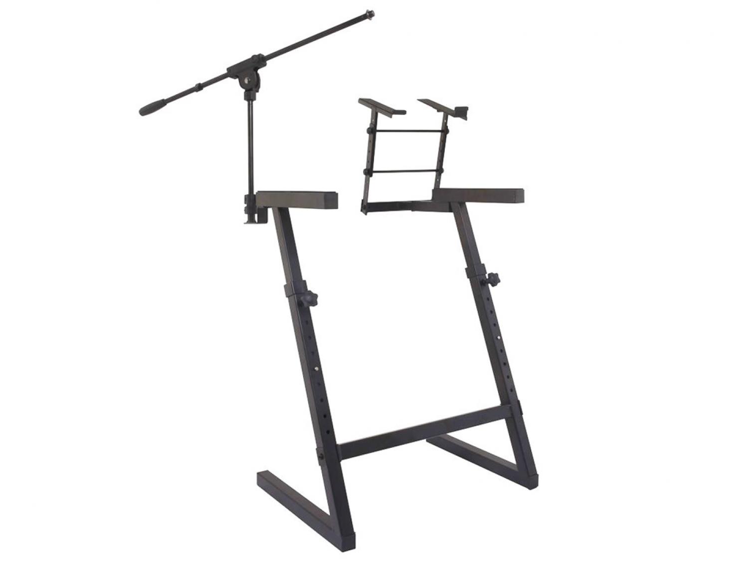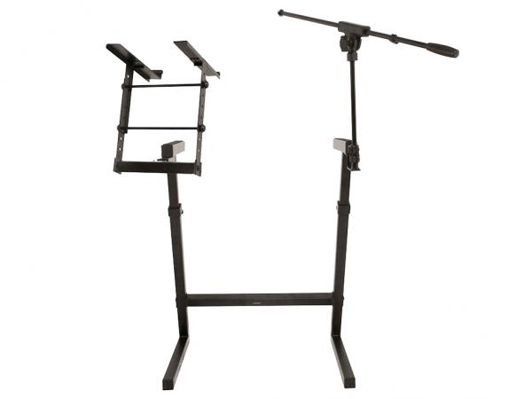 Supporto professionale regolabile per tastiera realizzato in acciaio. Può essere utilizzato anche per disporre la strumentazione da DJ. Si compone di una struttura con base di larghezza 600 millimetri fissa e con altezza regolabile. Dotato di asta microfonica ad altezza fissa con giraffa regolabile e supporto per computer regolabile in altezza.