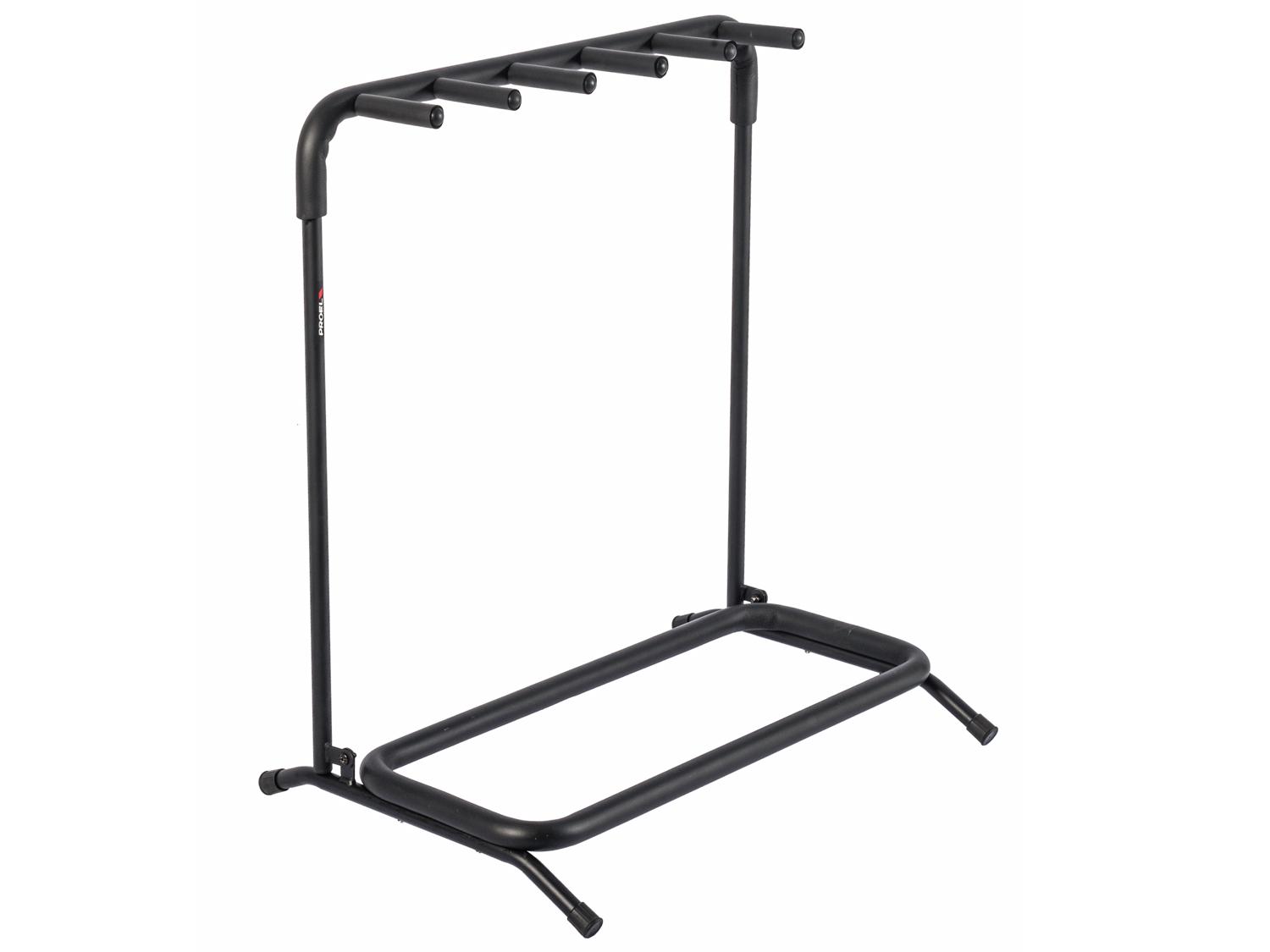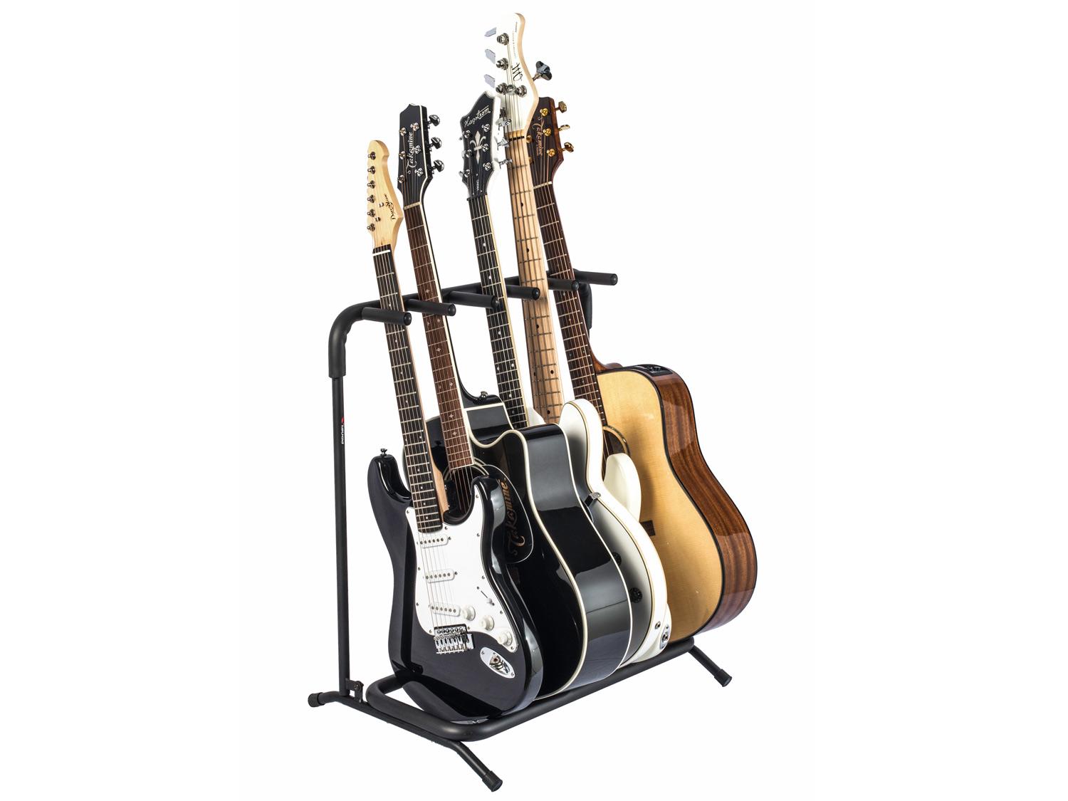 Supporto universale pieghevole, realizzato in acciaio, in grado di contenere cinque chitarre (classiche/acustiche/elettriche) o bassi. Le superfici di contatto sono realizzate con morbido materiale espanso che assicura la giusta protezione degli strumenti.