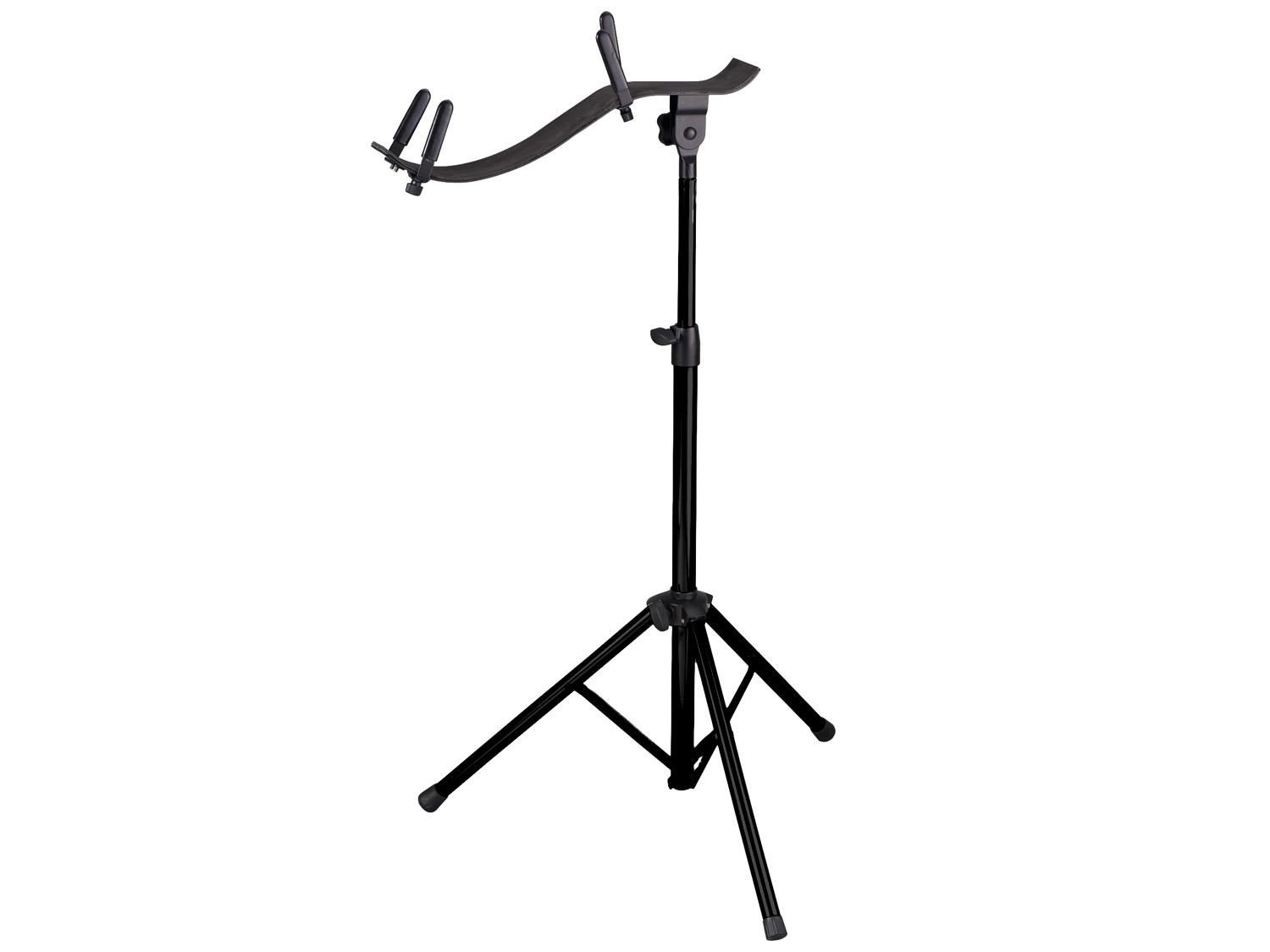 Supporto da pavimento per chitarra acustica che consente di sostenere lo strumento nella posizione d'uso. Costruito in acciaio verniciato nero, regolabile in altezza, è provvisto inoltre di regolazione dell'inclinazione e di un sistema di bloccaggio del braccio superiore. Il braccio è rivestito da morbido feltro a protezione dello strumento.