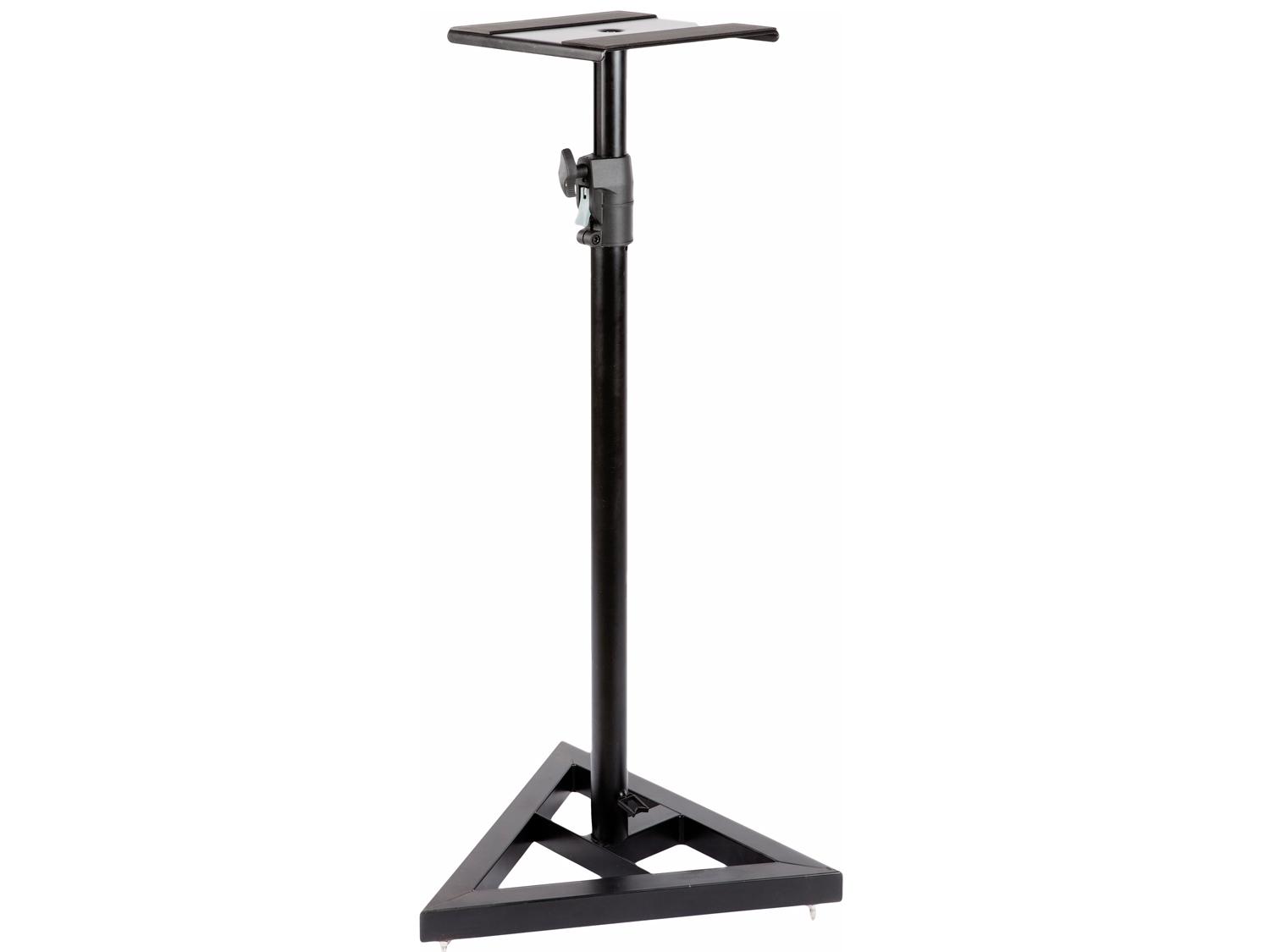 Supporto per monitor near-field a base triangolare. Equipaggiato con piedini conici per un isolamento ottimale dal terreno. La struttura tubolare in acciaio è provvista di un pratico sistema di regolazione dell'altezza con pin di sicurezza automatico. Perfetto per home recording e studi di registrazione. Disponibile in nero opaco.