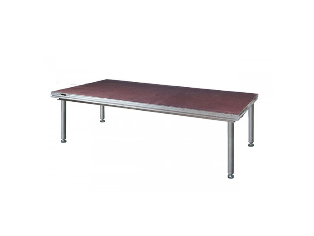 Pedana da palco in legno, con struttura in lega di alluminio (EN6005-t6) e gambe verticali in acciaio verniciato, regolabili su 3 diverse altezze (580- 850 - 1000mm). Piano in multistrato di betulla fenolico di 22mm con superficie antisdrucciolo; dimensioni: 2000 x 1000 mm.