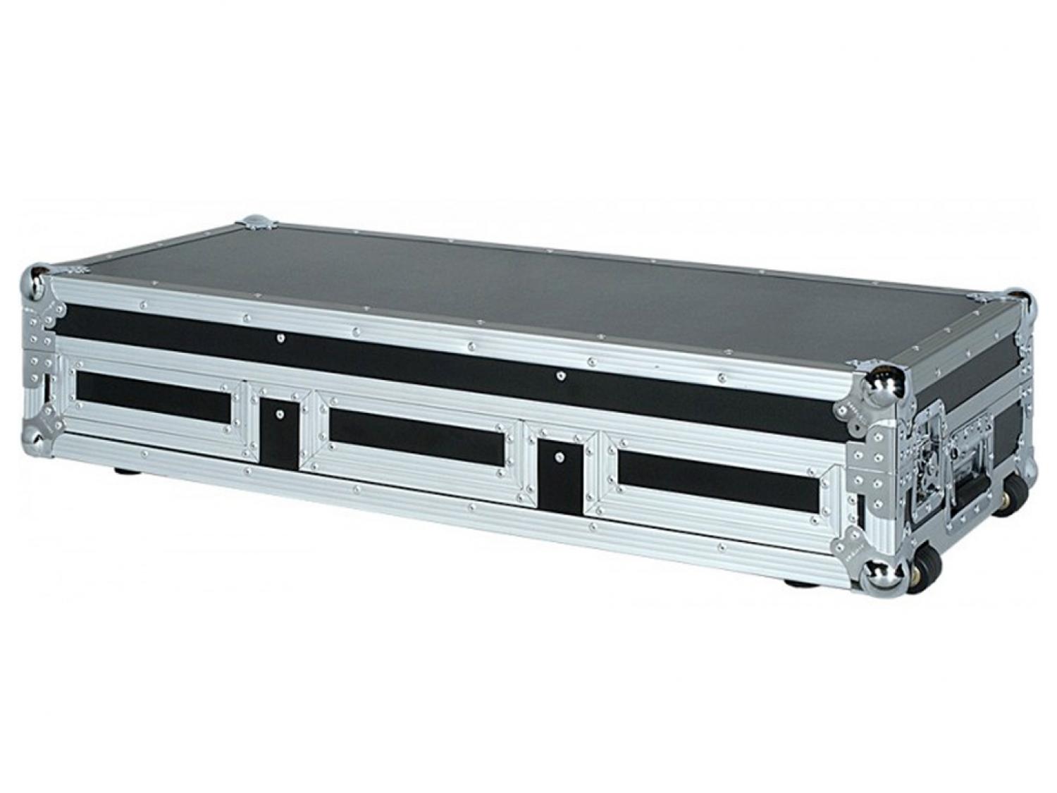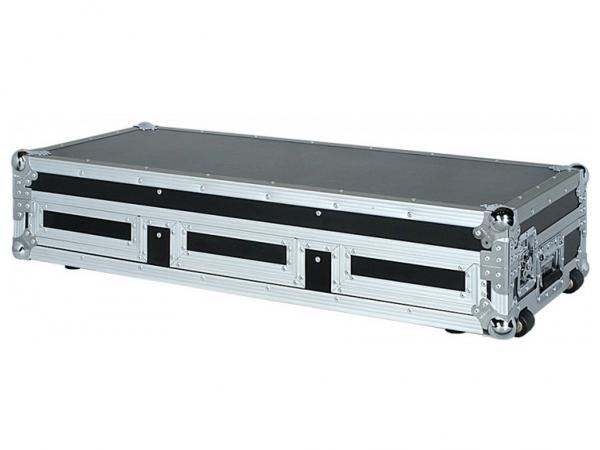 Nuova custodia professionale per DJ adatta a contenere una vasta gamma di CD player di grandi dimensioni, tipo Pioneer CDJ900/900NXS/2000/2000NXS e mixer da 12". Realizzata in multistrato di pino marino a 5 strati ad incollaggio fenolico dello spessore di 9mm. Rivestimento interno in foam sagomato ad alta densità e provvisto di spessori per essere adattato ad apparecchi di diversa dimensione. Provvista di piano scorrevole per laptop. Dotata di chiusure a farfalla in acciaio zincato, maniglia con ritorno a molla, angolari e rinforzi in acciaio zincato, profili in alluminio professionali e piedini industriali in gomma. Coperchio rimovibile. La custodia è inoltre provvista di due ruote da 40mm inserite nella struttura per consentire un facile trasporto.
