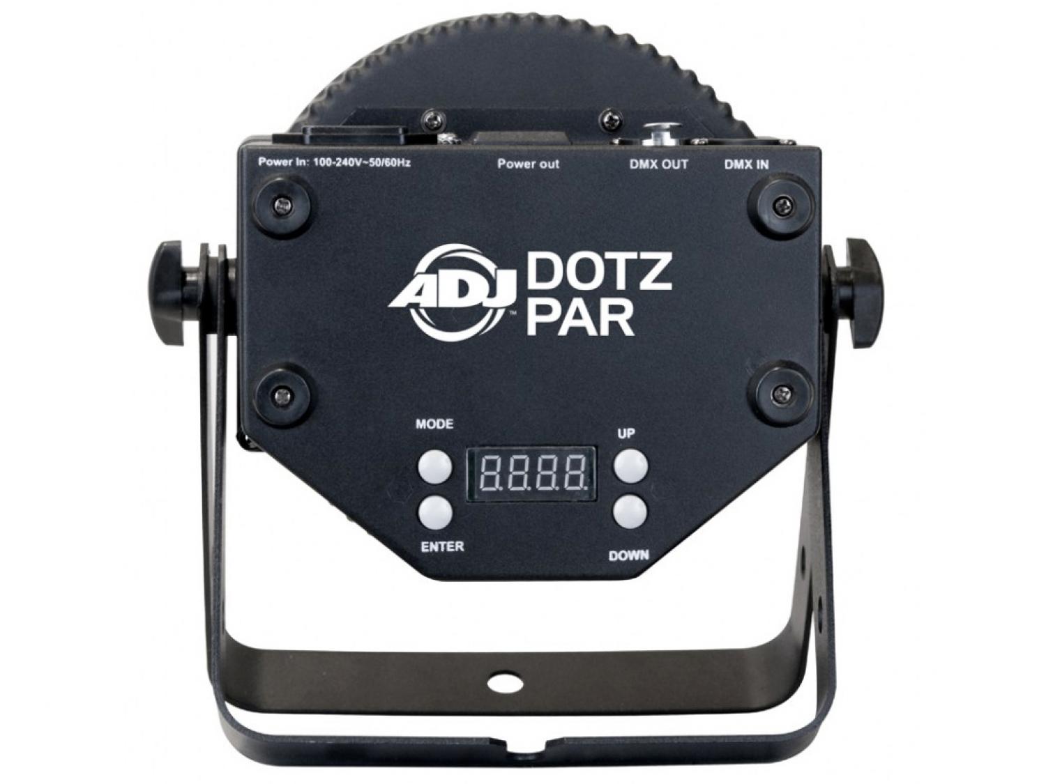 ADJ Dotz Par è equipaggiato con la nuova tecnologia COB (Chip On Board) che permette l'impiego di potenti LED in uno spazio ridotto. Il risultato è una elevata luminosità e un morbido mix colore senza ombre RGB. Ideale per band e DJ o per installazioni fisse in locali e club, Dotz Par è equipaggiato con un TRI LED COB da 36W. Dotz Par è dotato di un raggio di apertura di 60° (25° con la lente addizionale in dotazione), 4 modalità DMX, 35 macro colore incorporate e 5 curve di attenuazione selezionabili. Le numerose caratteristiche professionali includono: dimmer elettronico 100%, effetto strobo/pulsazione, assenza di sfarfallio, ingressi e uscite DMX e di alimentazione per collegamenti in catena e display DMX a LCD con menu a 4 pulsanti. Dotz Par può funzionare con i programmi incorporati, attivazione musicale o tramite una centralina DMX o con il telecomando ADJ Dotz RF.