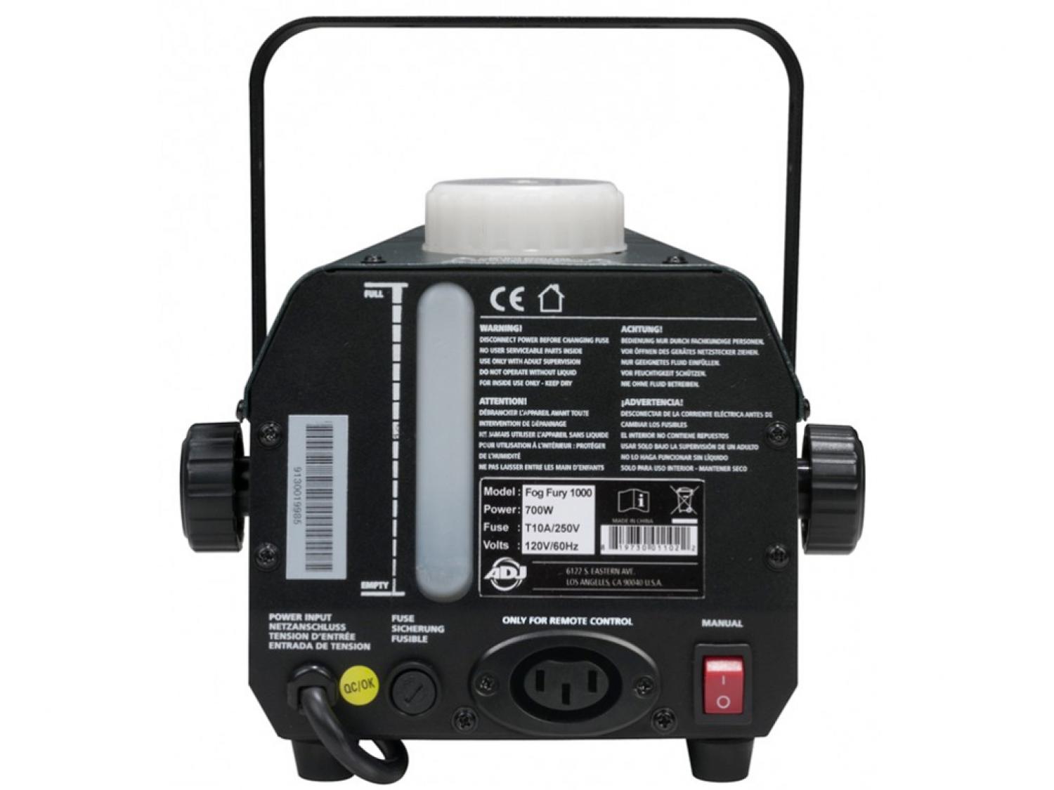 ADJ Fog Fury 1000 è una macchina del fumo compatta da 650 W ad elevata capacità di erogazione dotata delle più recenti innovazioni tecnologiche. È equipaggiata con una speciale caldaia che utilizza un sistema di trasmissione ad olio per prevenire otturazioni e di una pompa ad alte prestazioni per un'emissione ottimale del fumo. Fog Fury 1000 è anche dotata di comode funzioni come una finestrella sul retro per controllare il livello del liquido del fumo presente nel serbatoio e di un indicatore a LED che cambia colore per indicare se l'apparecchio è in fase di riscaldamento o se è pronto all'uso. Questa macchina del fumo produce 99 metri cubi di fumo al minuto, ha un serbatoio da 0,9 litri e un tempo di riscaldamento di 4 minuti. Questo apparecchio utilizza solamente liquidi del fumo a base acqua.