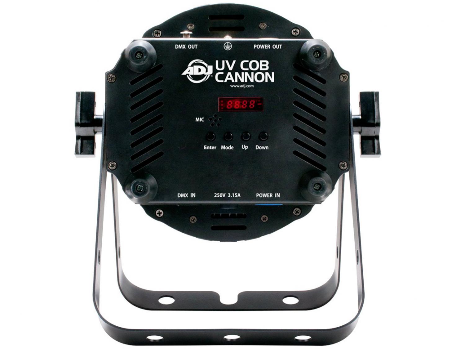 ADJ UV COB Cannon è un potente proiettore Wash a luce ultravioletta equipaggiato con la più recente tecnologia LED COB (Chip On Board) che permette l'utilizzo di LED ad alta potenza in proiettori di ridotte dimensioni. Questo proiettore professionale è stato progettato per l'illuminazione wash di palchi, per produzioni teatrali ed effetti speciali. Richiede una manutenzione estremamente ridotta grazie all'avanzata tecnologia adottata. UV COB Cannon ha 3 modalità operative (attivazione musicale, manuale o DMX), 3 modalità DMX, 5 curve di attenuazione selezionabili, display con menu DMX a 4 pulsanti ed è privo di sfarfallio per permetterne l'utilizzo per riprese TV e cinematografiche. Il collegamento DMX è tramite cavo XLR a 3 pin e quello di alimentazione è con connettori PowerCon. La sorgente luminosa è un cluster 9x6 (54) di LED COB UV da 1,5W per una potenza totale di 80W.
