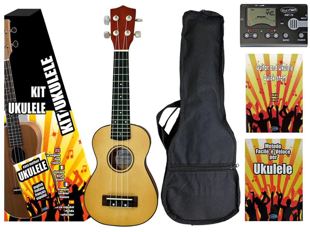 Kit composto da un ukulele soprano corredato da tutti gli accessori che servono per iniziare subito a suonare. La confezione contiene un accordatore, una custodia morbida ed un manuale didattico per l'apprendimento dello strumento.