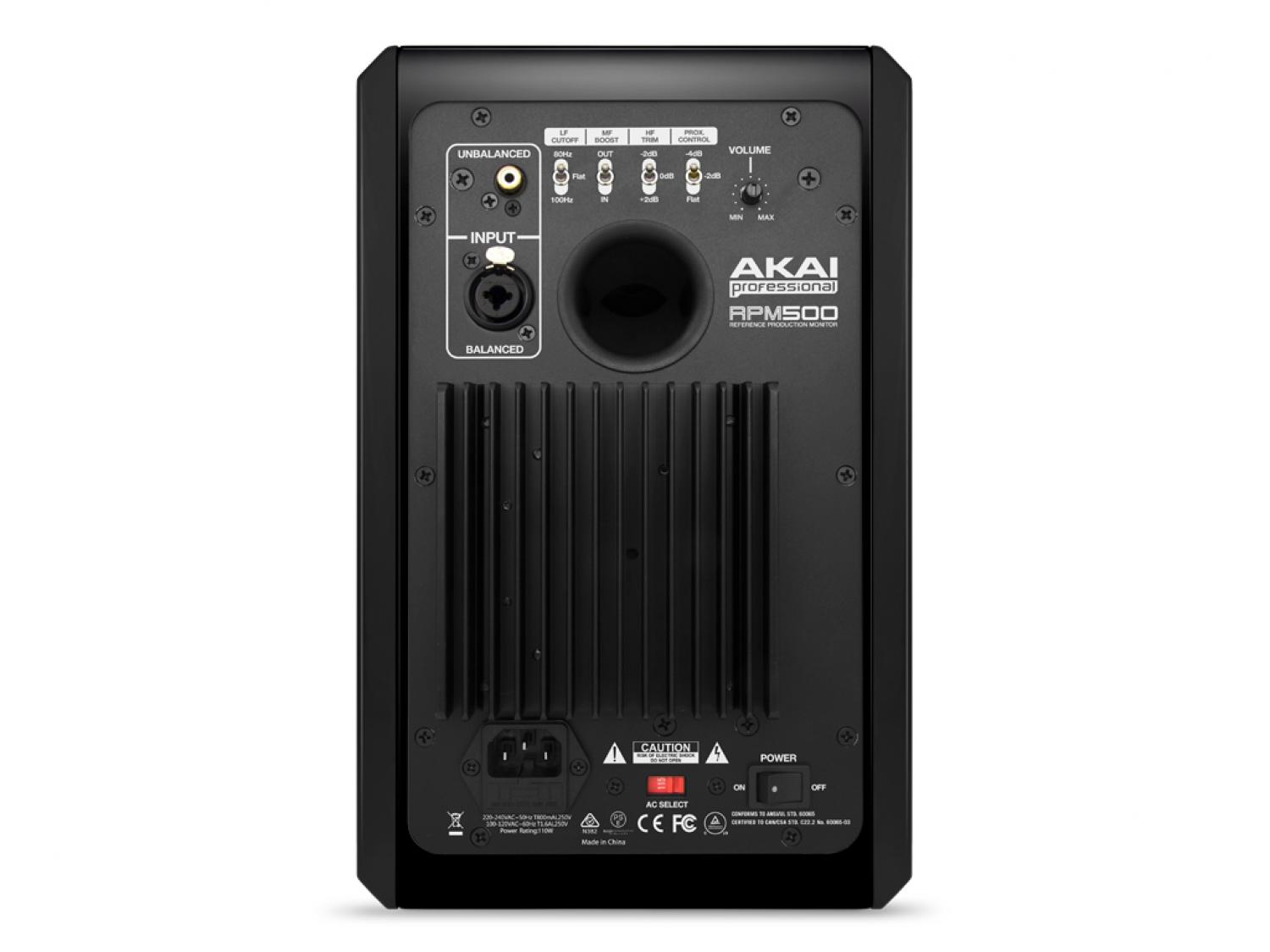 La linea di monitor RPM della Akai Professional da oggi può contare sui due modelli professionali, con woofer da 5" ed 8", progettati per le attuali esigenze dello studio di registrazione. Gli Akai RPM500 sono diffusori amplificati da 90W in classe A/B, dalla risposta in frequenza precisa e adattabili a vari posizionamenti grazie alle impostazioni applicabili dall'utente e al pad isolante da posizionare sotto i diffusori, al fine di evitare la trasmissione delle vibrazioni attenuando così l'influenza della superficie di appoggio sul suono generato. Il cabinet, laccato esternamente, è costruito in MDF e rinforzato per minimizzare le riflessioni interne e le colorazioni indotte. Isolati da interferenze radio e magnetiche e protetti dal surriscaldamento, i monitor da studio amplificati Akai Professional RPM500 sono dotati di un filtro per le frequenze subsoniche e di protezione ai transienti indotti dall'accensione e dallo spegnimento. Nel retro, questo monitor da studio amplificato è dotato di potenziometro per il controllo del volume, di ingresso combo per connettori bilanciati XLR o jack da 1/4" TRS, di un ingresso sbilanciato RCA e di vari controlli per correggere la risposta in frequenza in base al posizionamento, quali un interruttore a 3 posizioni per attenuare l'effetto prossimità dai 200Hz in giù, trim per le alte, boost (+2dB tra i 1000/3000Hz) per le medie, e di un taglio sulle basse frequenze.