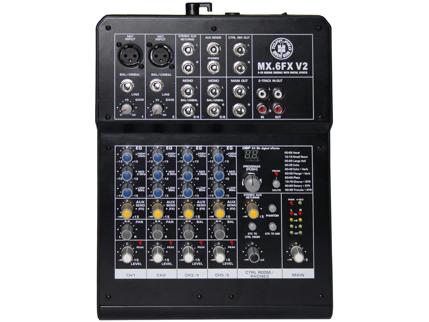 Il Topp Pro MX.6FX V2 è un mixer compatto di ottima qualità con un set di funzioni molto completo. Con 2 ingressi microfonici e 2 ingressi stereo di linea è l'ideale per piccoli spettacoli dal vivo, studio di registrazione e applicazioni generali PA. L'MX.6FX V2 include anche un multi effetto digitale a 24 bit con 16 preset. C'è un equalizzatore a 3 bande su tutti i canali di ingresso e sono disponibili uscite separate Mix e Control Room per il funzionamento in diverse configurazioni. Ideale per piccoli concerti e la registrazione. Il Topp Pro MX.6FX V2 è uno strumento flessibile anche per applicazioni multimediali.