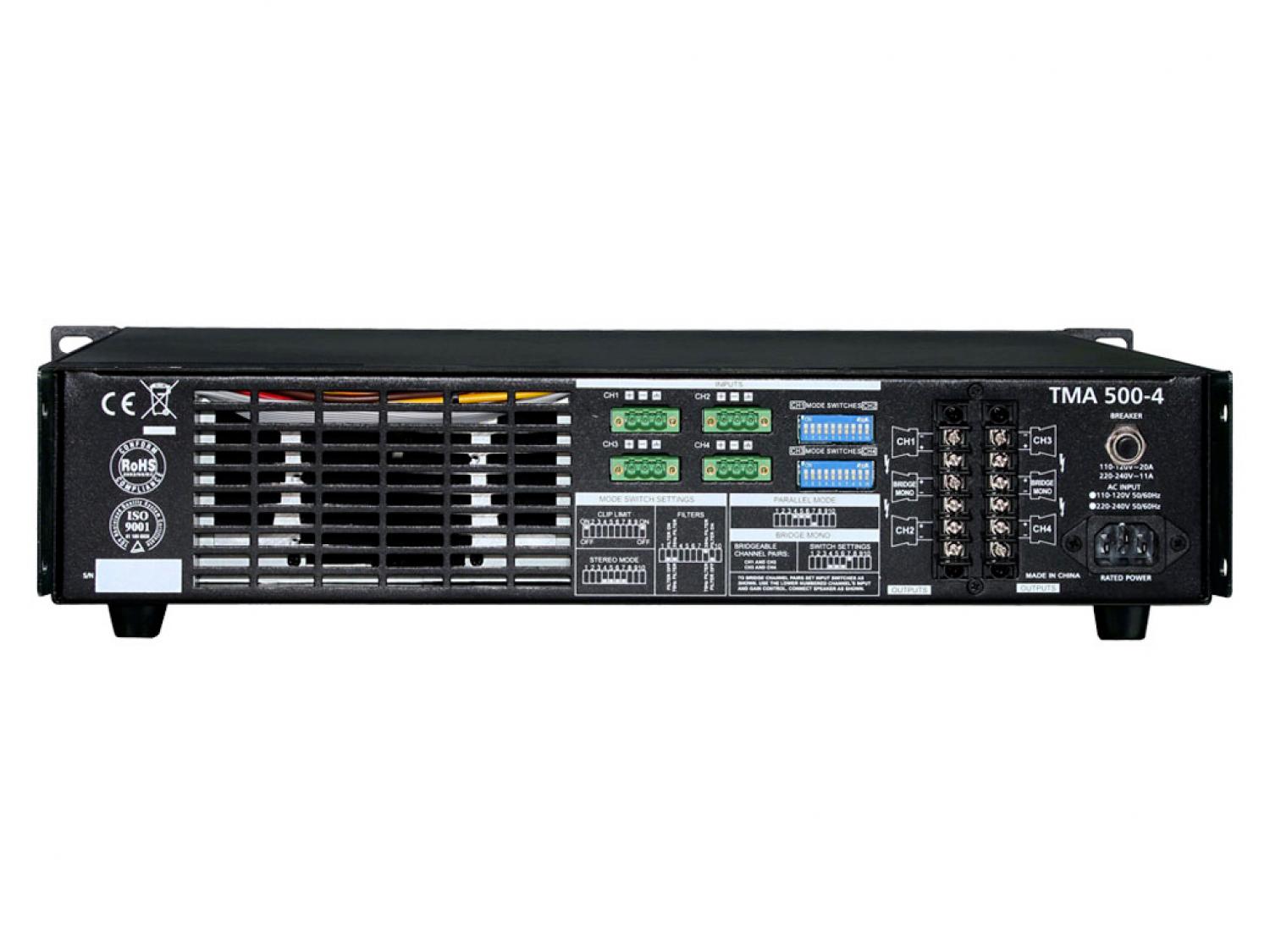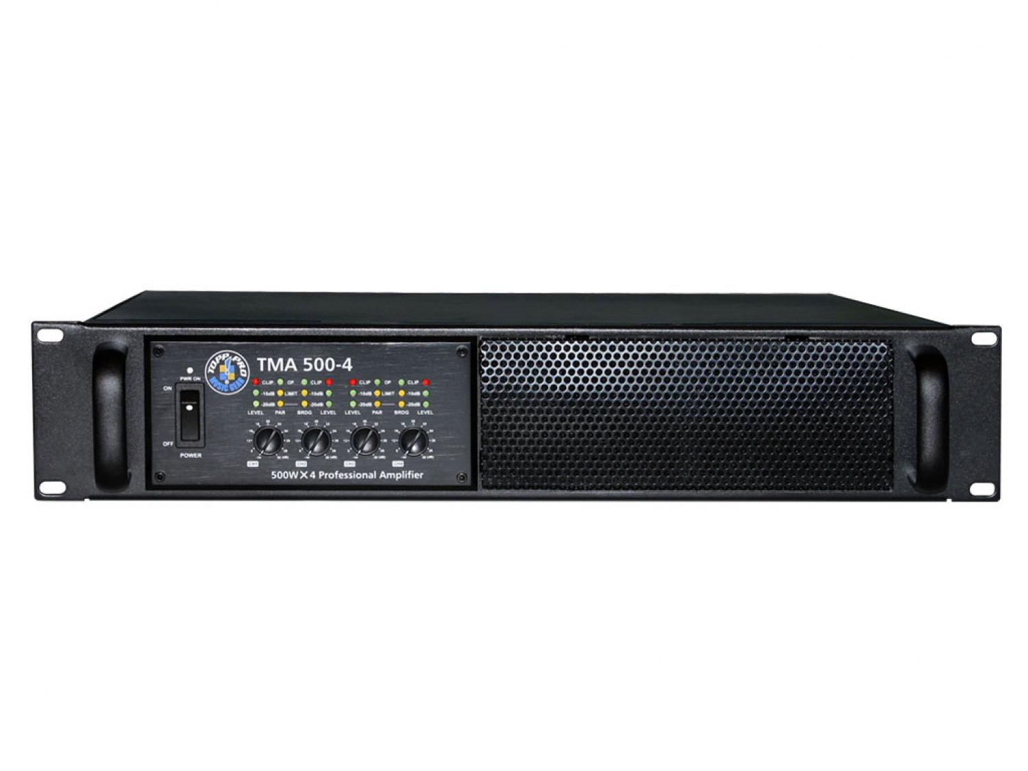I finali di potenza a quattro canali TMA 250-4 / 500-4 sono progettati per un uso professionale e offrono una qualità impareggiabile. Comprendono un avvio soft, limite del segnale, due ventole a velocità variabile e basso rumore ed un display a LED. Ogni canale è dotato di circuiti di protezione indipendenti contro open circuit, corto circuiti, carichi non corrispondenti e surriscaldamento. Comprendono quattro canali indipendenti con alimentazione separata. Inoltre, ogni canale ha anche un LED principale che diventa verde per l'indicare l'accensione e per il muting o la protezione, un altro LED rosso che mostra il clipping dell'amplificatore ed uno giallo per il limit stage. I componenti di alta qualità ed i circuiti accuratamente progettati garantiscono eccellenti prestazioni audio ed una risposta in frequenza estremamente lineare, garantendo un suono cristallino nella gamma alta, e basse frequenze piene. Questi amplificatori garantiscono una affidabilità totale ed un utilizzo senza problemi anche nelle condizioni più difficili. Riteniamo che il TMA20-4 / 500-4 non abbiano solo un grande look, ma offrano prestazioni perfette, ciò che si ottiene sono prestazioni senza precedenti ad un prezzo incredibilmente attraente.