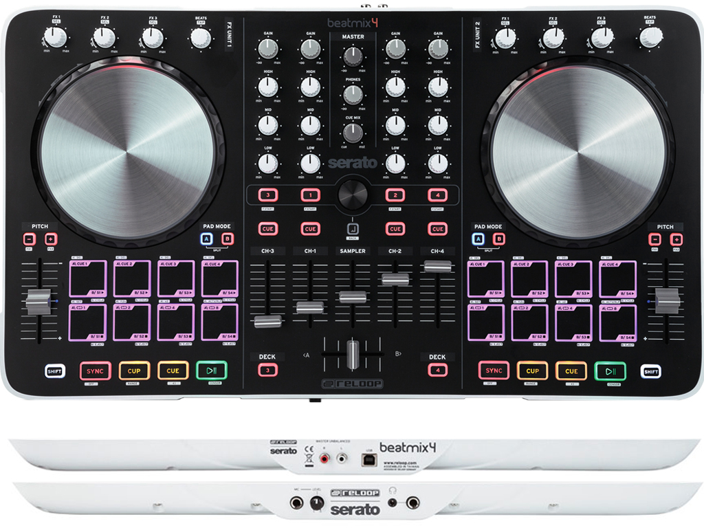 BeatMix 4 è un nuovo Pad controller MIDI / USB di Reloop appositamente creato per l'utilizzo con il software Serato ed il mixaggio a 4 deck. Il layout ergonomico è stato ottimizzato per facilitare tutte le operazioni di mix, e offre ai DJ un controllo intuitivo e veloce dei parametri del software. BeatMix 4 è caratterizzato da una costruzione robusta e da elementi di alta qualità, ideale per DJ principianti ed esperti, e per l'utilizzo nei club. BeatMix 4 consente di accedere alla maggior parte delle funzioni del software Serato senza dover toccare il computer, la consolle infatti dispone di controlli dedicati per i deck, due sezioni effetti indipendenti, mixer a quattro canali con EQ a tre bande e gain, nonchè 16 drum pad luminosi multi colore per l'accesso diretto al campionatore, loop e cue point.