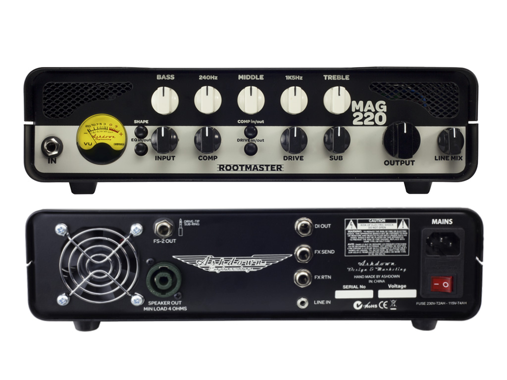 La testa Rootmaster RM-220 dispone di un completo Pre Amp con un classico EQ 5-bande, un nuovissimo compressore oltre agli effetti Drive e Sub Harmonic selezionabili da footswitch. Una solida sezione di potenza da 220 ​​Watt fornisce la grinta, mentre altre caratteristiche includono un ingresso ausiliario mini jack con controllo di livello, loop effetti, DI, Speakon / Jack Out ed un ingresso jack per un footswitch FS-2 opzionale.
