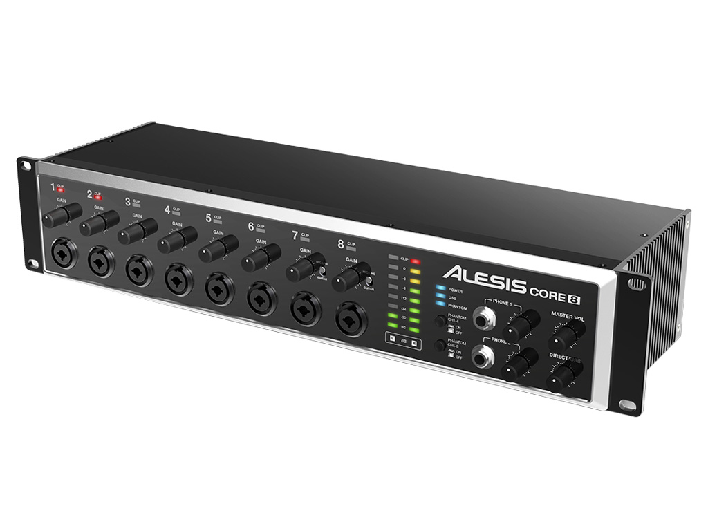 Alesis CORE 8 è l'ammiraglia della serie di interfacce audio USB Alesis. Costruita attorno ad un chassis dall'ingombro di due unità rack standard 19", Alesis Core 8 è un'interfaccia audio USB 2.0 equipaggiata di convertitori A/D-D/A a 24-bit / 96kHz e fornita di 8 ingressi mic/line combo (Jack 1/4" e XLR) con controlli di guadagno, indicatore di clip a LED, e alimentazione Phantom (attivabile a blocchi di 4 canali), e di cui due, il 7 e l'8, commutabili Hi-Z per il collegamento diretto (funzione DI) di strumenti elettroacustici quali chitarre e bassi elettrici. Per quanto riguarda le uscite, nel pannello frontale troviamo due prese cuffia su Jack TRS da 1/4" con controlli di volume indipendenti, mentre nel pannello posteriore troviamo le uscite Stereo Main e 4 Monitor Out tutti in formato Jack da 1/4". Per chiudere l'elenco di dotazioni si segnalano nel pannello frontale 2 barre da 8 LED per il monitoraggio visivo del livello del segnale, i potenziometri rotativi per il controllo del volume di uscita (Master) e del direct monitoring in tempo reale "Mix" (Direct/USB), e altri tre indicatori LED dedicati rispettivamente alla segnalazione dell'accensione, dell'alimentazione Phantom e del collegamento USB.