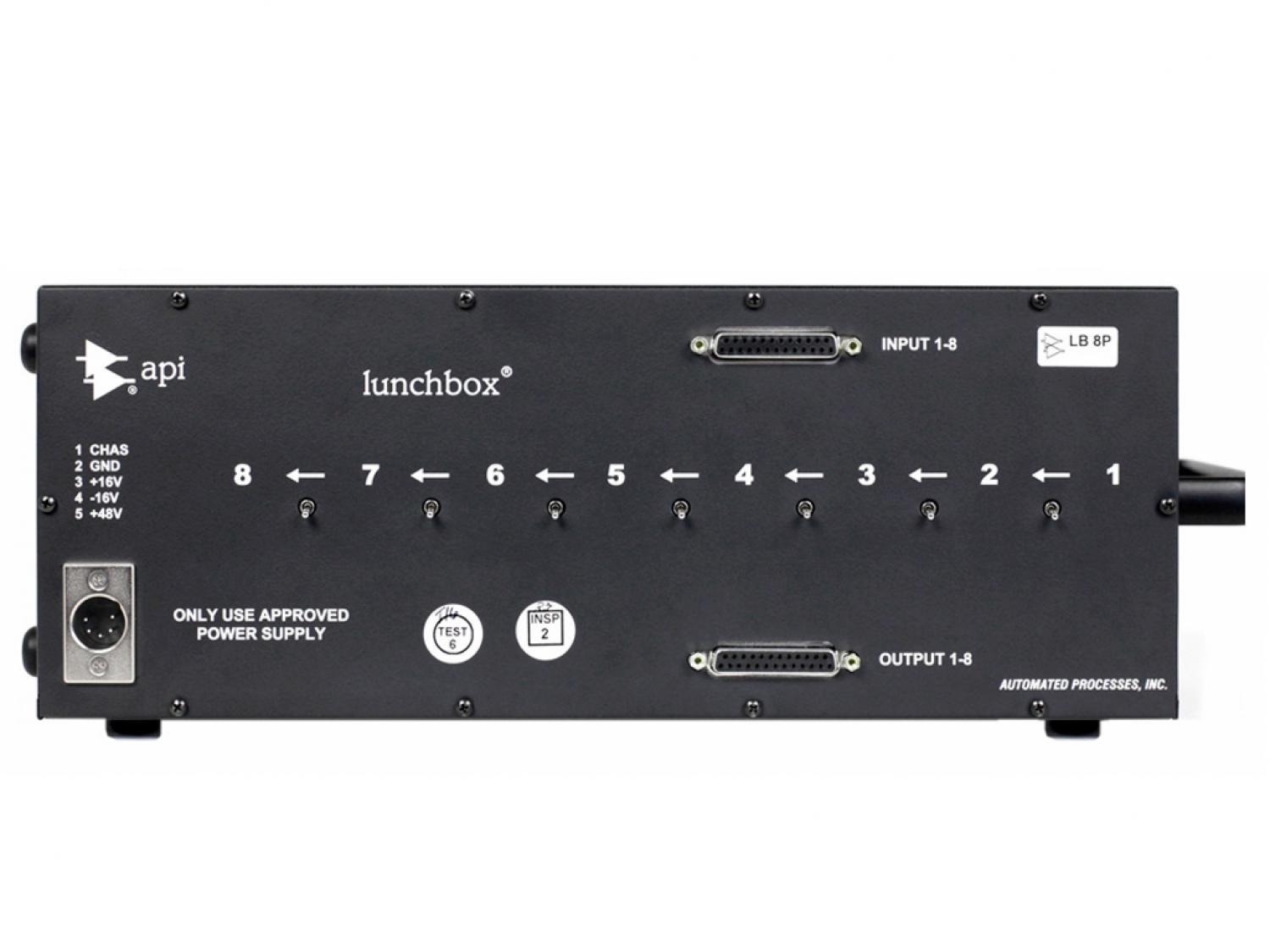 l'API 500-8B include tutte le caratteristiche che hanno reso celebre il 500-6B nel settore, inclusi i connettori DB-25 (D-Sub) per un I/O facile, alimentazione universale (100 o 250V, 47-63Hz), alimentazione Phantom, ed un facile montaggio a rack con il kit di alette opzionale. Costruito per la prestazione robusta, con i nuovi interruttori a levetta per il linking dei canali. Il lunchbox dà agli ingegnere la possibilità di portare con sé effetti EQ specifici per ogni situazione: 550A, 550B e 560 ed è autoalimentato.