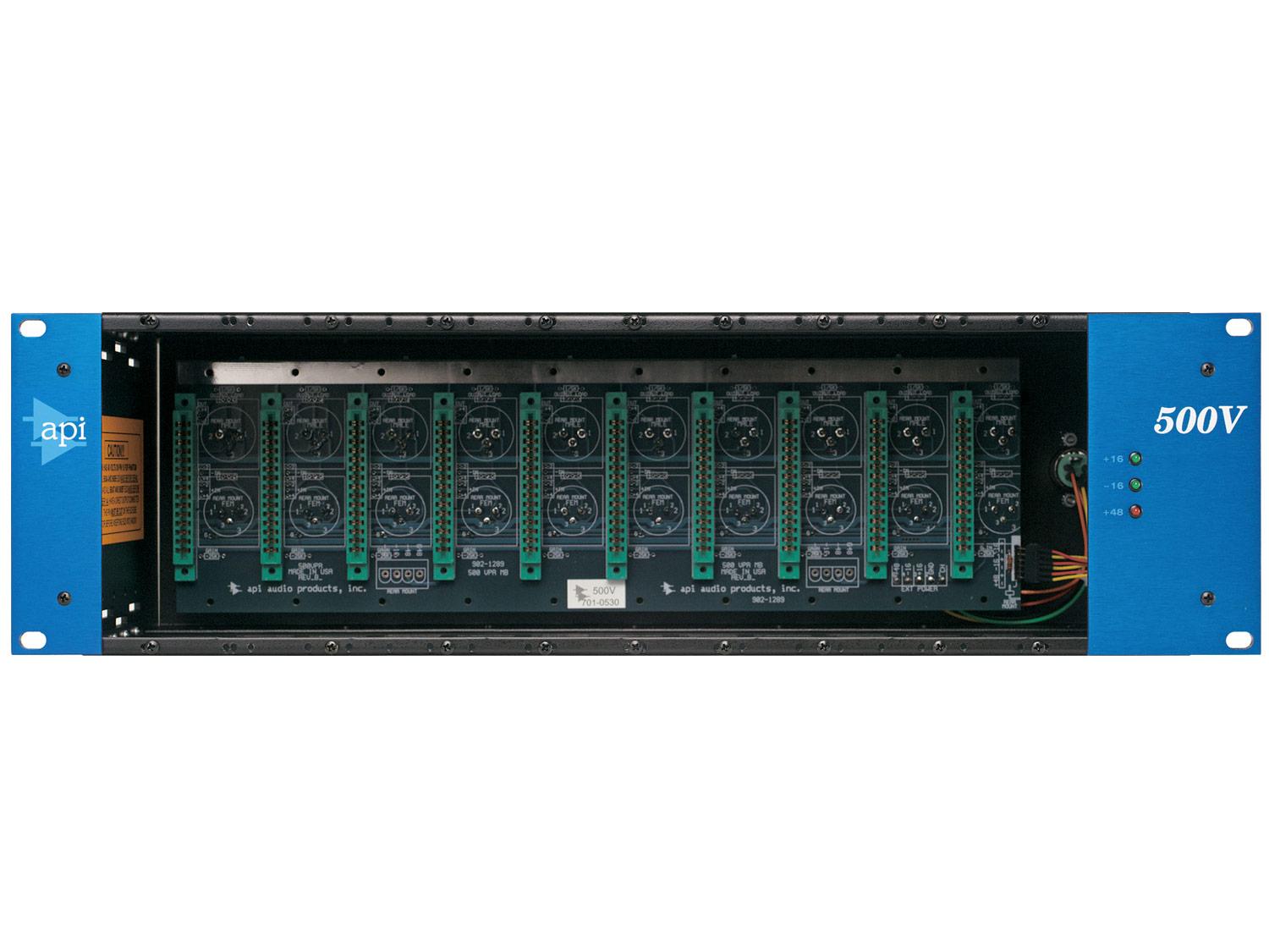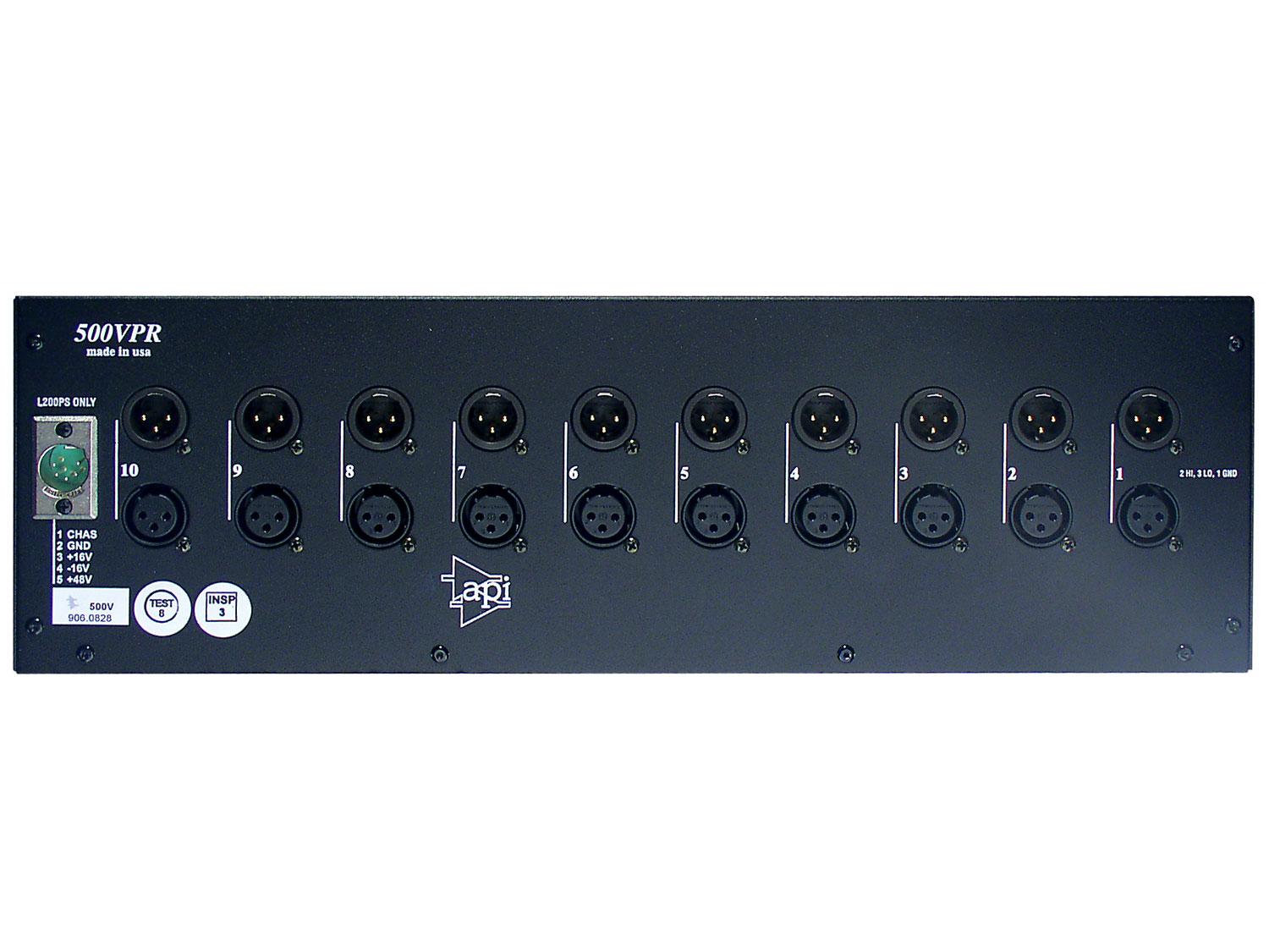 Il modello API 500VPR è alimentato da un alimentatore esterno tripolare, progettato per ospitare dieci moduli API nel formato standard 5,25" x 1,5". Le connessioni In e Out sul pannello posteriore sono XLR, il 500VPR è internamente libero da cablaggi preimpostati in modo da consentire la massima libertà di ruoting sfruttando le connessioni sul pannello posteriore.