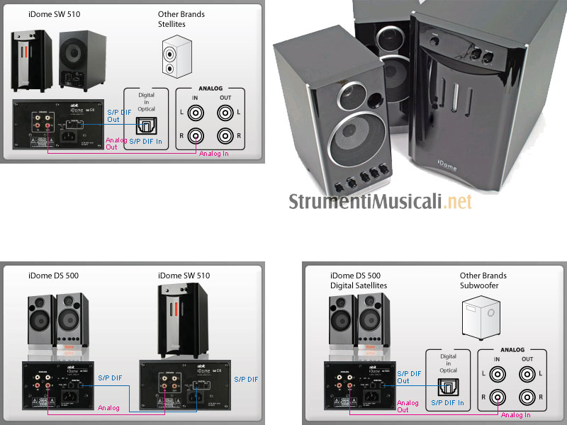 • Gli altoparlanti iDome possono essere connessi a qualsiasi surround sound setup analogico o digitale 2 o 2.1. Varie opzioni possono essere applicate e voi dovreste scegliere quella che soddisfa le vostre esigenze. Per cortesia siate consapevoli che gli altoparlanti sono stati concepiti per funzionare con ogni speaker system, ma saranno migliori nel suono e nell'aspetto come set completo 2.1 e quando vengono collegati ad una sorgente unicamente digitale.