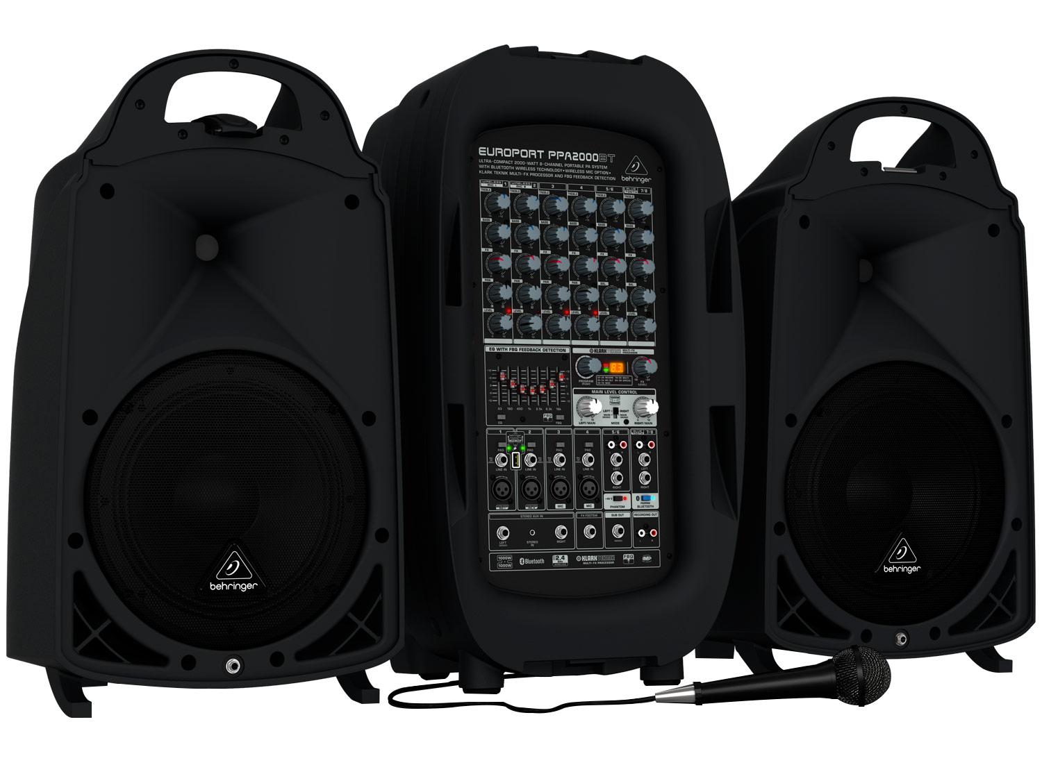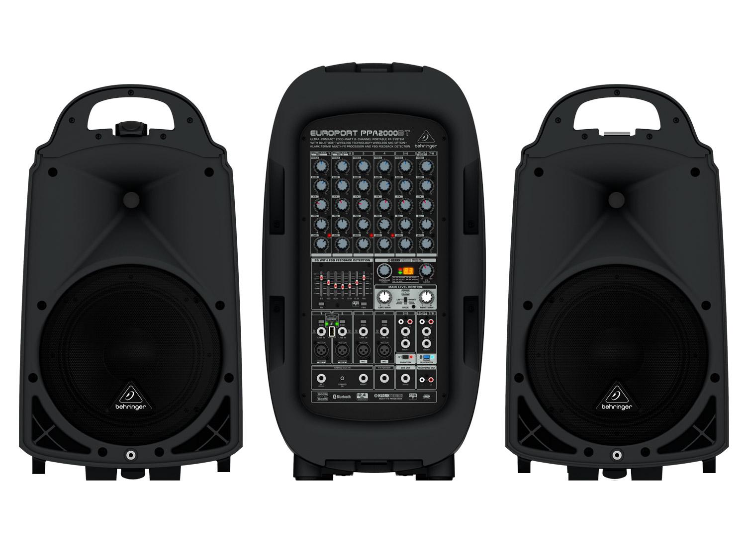 L'Europort PPA2000BT racchiude una sorprendente qualità del suono in una valigetta compatta, portatile, incredibilmente veloce e facile da configurare. Il Mixer integrato a 8 canali del PPA2000BT dispone di ingressi sufficienti per 4 microfoni, 2 strumenti, per il tuo lettore MP3 preferito ed altro che lo rendono ideale per feste, scuole, presentazioni aziendali e didattiche, musicisti e anche matrimoni. La connettività Bluetooth integrata consente di ascoltare musica in streaming dal tuo smartphone, tablet o da qualunque altro dispositivo dotato di Bluetooth. Questo potente meraviglia dispone anche di effetti KLARK TEKNIK e del pratico sistema di rilevamento del feedback FBQ per suoni cristallini senza feedback.