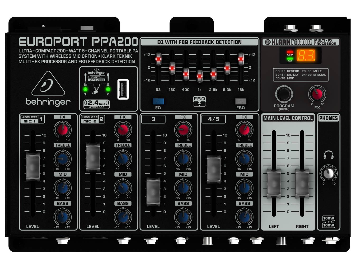 L'Europort PPA200 racchiude una sorprendente qualità del suono in un sistema PA da 150 Watt, stile valigetta, compatto, portatile, incredibilmente veloce e facile da configurare. Questo potente piccola meraviglia dispone anche di effetti KLARK TEKNIK e del pratico sistema di rilevamento del feedback FBQ per suoni cristallini senza feedback. Ma soprattutto il PPA200 è "Wireless Ready" per i microfoni digitali Behringer ULM. E' stato anche incluso un microfono professionale XM1800S e tutti i cavi e gli accessori di cui avrai bisogno.