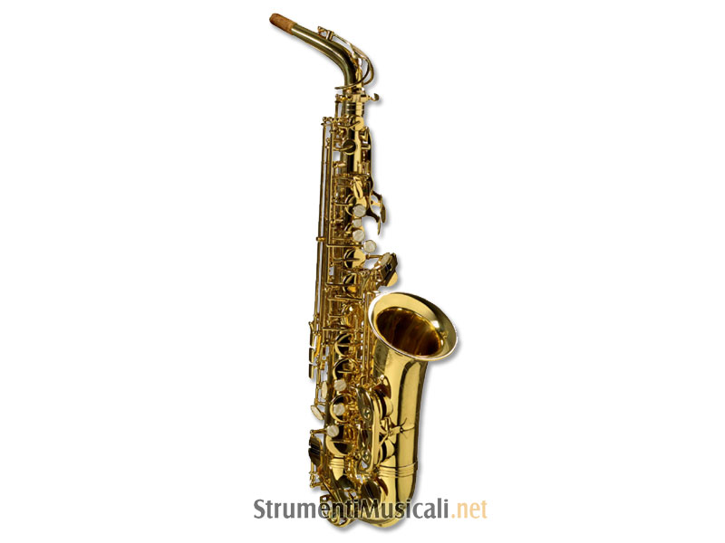 Sax alto con chiave del FA# acuto, finitura con laccatura dorata lucida corpo e chiavi.