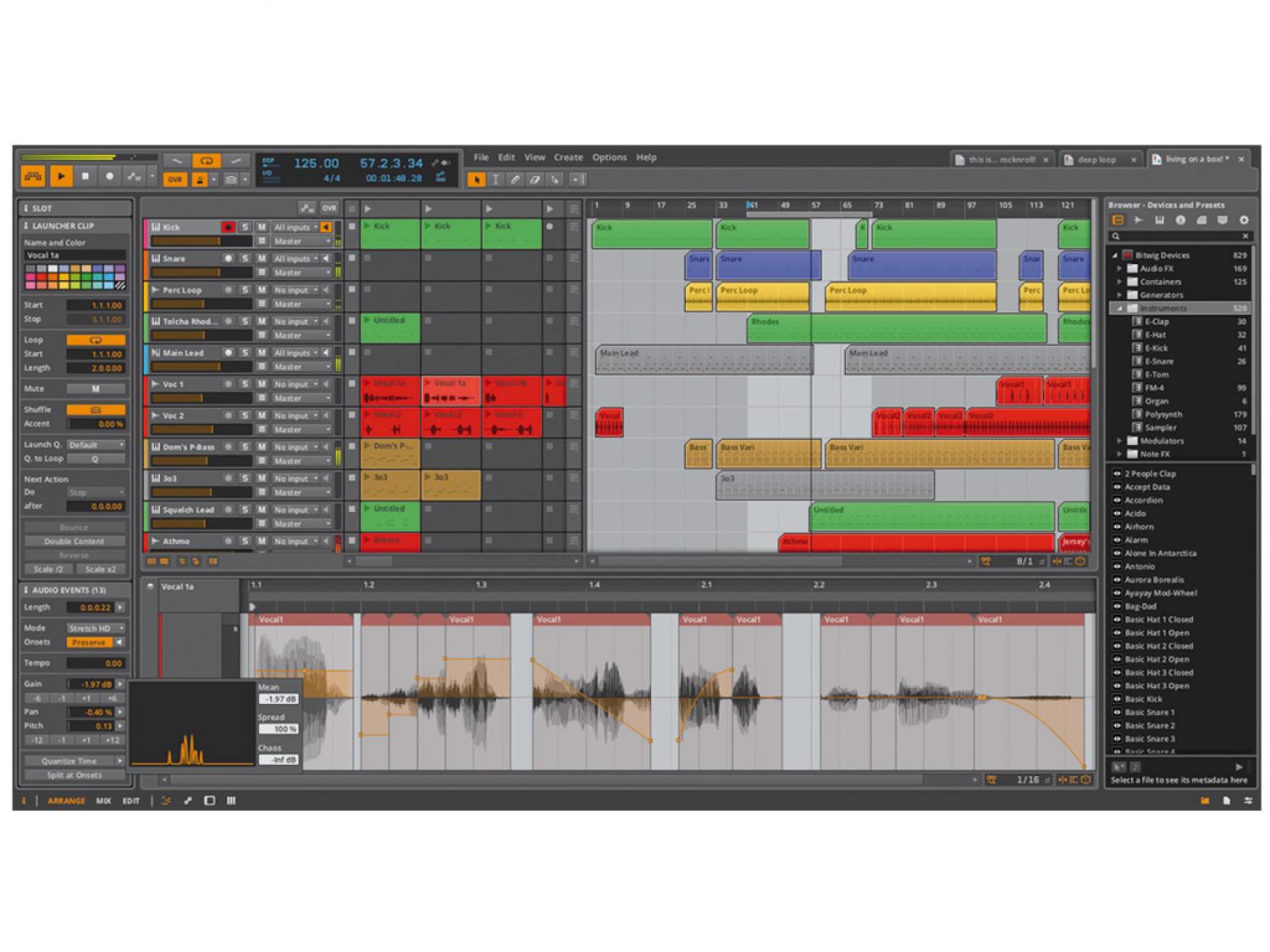 Bitwig Studio è un nuovo ed innovativo software per la creazione musicale, la registrazione e l'utilizzo Live che supporta i tre più importanti sistemi operativi: Windows, Mac OS X e Linux. Combinando il mondo del sequencing tradizionale con quello dei moderni software clip-oriented (più indirizzati alla performance dal vivo), Bitwig Studio rappresenta l'ultima soluzione per la realizzazione di tutte le tue idee musicali in ogni stadio della produzione. Bitwig Studio offre un motore audio allo stato dell'arte con pieno supporto multi processore, un sistema di brigging interno per i plug-in VST 32/64-bit e protezione dai crash per i plug-in VST. Bitwig Studio ha in dotazione oltre 50 device: Synth (Polysynth, FM-4, Organ, Sampler e Drum Modules in stile analogici) effetti (Delays, Equalizzatori, Compressori), ed anche Container devices (contenitori nei quali inserire moduli in parallelo o in catena), Note FX, e dispositivi di modulazione (controlli aggiuntivi come LFO, envelope follower e step sequencers per modulare ogni altro device).