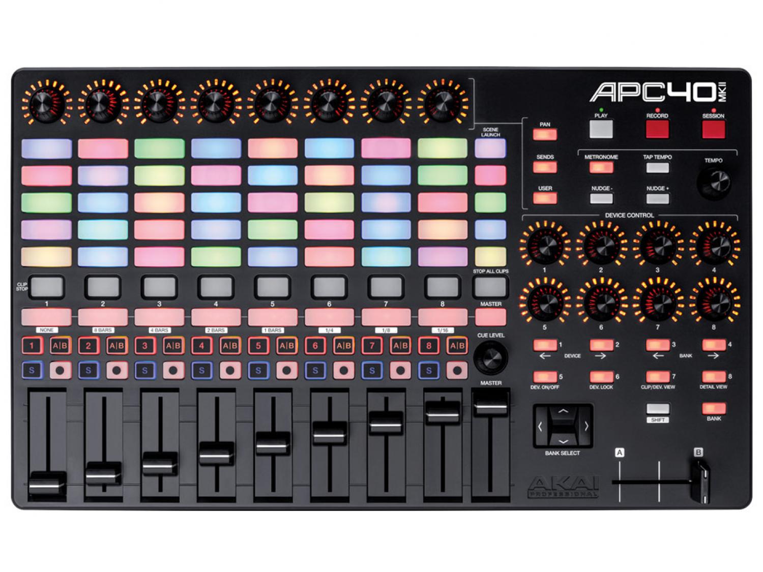 Nel 2009, Akai Professional ha avviato una stretta collaborazione con gli sviluppatori del software Ableton Live, da questa partnership è scaturita la produzione dell'Ableton Performance Controller, il MIDI USB Controller APC40. Alla base del nuovo APC40 mkII vi sono quindi 5 anni di feedback ricevuti dall'utenza di tutto il mondo, che hanno consentito di rivedere e migliorare le funzioni, oltre che fornire funzionalità estese per un'esperienza di utilizzo più fluida ed immediata. Non solo un design più moderno, sottile e meno ingombrante, ciò che balzerà subito all'occhio dei veterani della serie APC saranno la griglia per il controllo delle clip, che utilizza dei pad in gomma retroilluminati multicolore (RGB), una differente predisposizione delle knob, le quali, come i fader, al tatto si dimostreranno più robuste. Il layoutdell'Akai Pro APC40 MKII ricalca quello di un mixer 8 canali, più uno master. Ogni channel strip fornisce un robusto fader, pulsanti solo, armatura della traccia, assegnazione al crossfader (A/B) e selettore di canale, un più ampio pulsante rettangolare per l'attivazione/disattivazione del canale con doppia funzionalità a mezzo della funzione Shift per la selezione del valore di quantizzazione del progetto. Proseguendo verso l'alto, ciascun canale fornisce un tasto "Stop Clip", i 5 pad retro-illuminati RGB e un potenziometro rotativo circondato dalla corona di led che ci consentirà di visualizzare il valore del parametro controllato. Questo potenziometro rotativo controllerà, a seconda del banco selezionato, Pan, Send e ciò che configureremo nel banco User. Sul canale Master, oltre al fader, troviamo il potenziometro rotativo per il controllo del volume di pre-ascolto, pulsante per l'on/off del canale, pad per l'interruzione di tutte le clip e 5 pad per la riproduzione delle scene della matrice di clip selezionata. Per il controllo remoto dei device (effetti e strumenti virtuali caricati sui canali) non poteva mancare la sezione ad 8 controlli rotativi operanti su più banchi, la quale si mappa automaticamente una volta selezionato il device mediante i relativi tasti freccia che ci consentono di scorrere tra gli effetti caricati sul canale. Come da tradizione APC, anche per questa sezione, ogni potenziometro offre il classico feedback visivo del valore di ciascun parametro a mezzo della corona di led che lo circonda. Come nel modello precedente, troviamo il crossfader, poi un potenziometro "Tempo", per l'impostazione della velocità in BPM, il tasto tap tempo, due tasti nudge + e -, per simulare il pitch bending, e il pulsante per l'attivazione/disattivazione del metronomo. APC40MKII è naturalmente pre-mappato di fabbrica per lavorare simultaneamente e in piena sinergia con il software Ableton Live. Collegato al computer via USB, i controlli fisici dell'hardware corrisponderanno precisamente a quelli del layout virtuale del software. Ciò non significa che non possiate utilizzare mappature customizzate a vostro piacimento; trattandosi di un MIDI controller potrete liberamente riprogrammare la mappatura a vostro piacimento, in base alle vostre esigenze di produzione o live performance. Akai Professional APC40 MKII è una periferica USB/MIDI plug-n-play, che si alimenta direttamente tramite la porta USB del vostro computer, quindi usabile ovunque voi vogliate.
