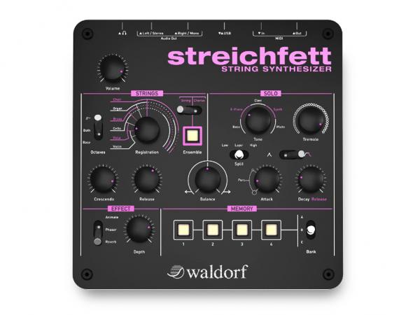 Waldorf con il nuovissimo Streichfett riporta in vita i gloriosi String Synthesizer che hanno caratterizzato buona parte della musica degli anni '70 e '80. Il Waldorf Streichfett si presenta come unità portatile compatta stand-alone ed è basato sullo chassis ormai ben consolidato usato per il synth parafonico Rocket e per il nuovissimo filtro Waldorf 2-Pole. Il doppio motore di sintesi integra una sezione archi polifonica completa e una sezione "Solo" monofonica. Il pulsante Ensemble interviene sull'amalgama della String Section, mentre la sezione Effect consente di aggiunge riverbero, phaser o un particolare effetto "Animate". La sezione Solo include i preset Bass, E-Piano e Clavi, tutti suoni realizzati per essere adatti ad integrarsi con la String Section. Nella sezione Memory si possono salvare fino a dodici patch e la dotazione on board è completata dalle connessioni MIDI e USB.
