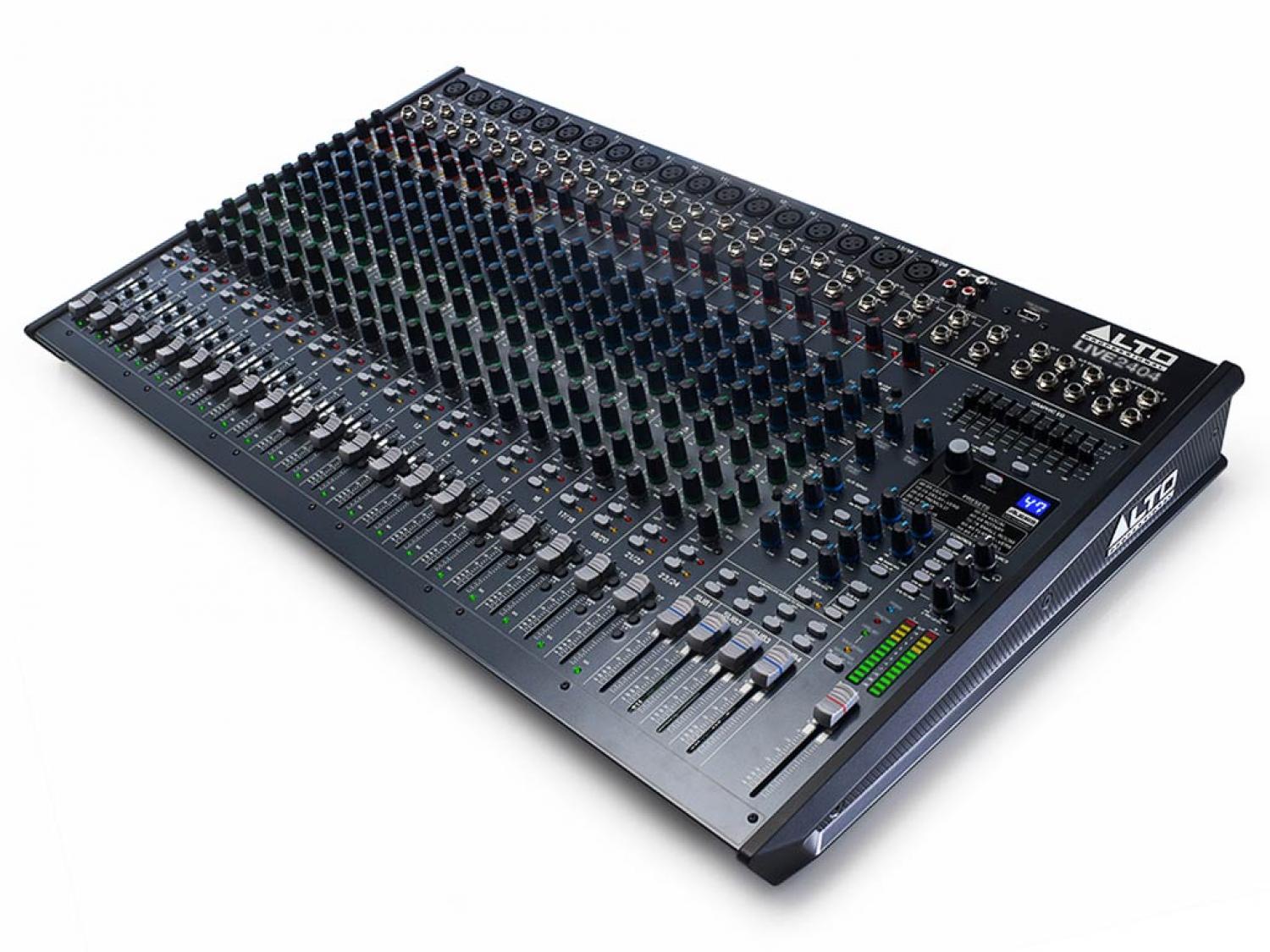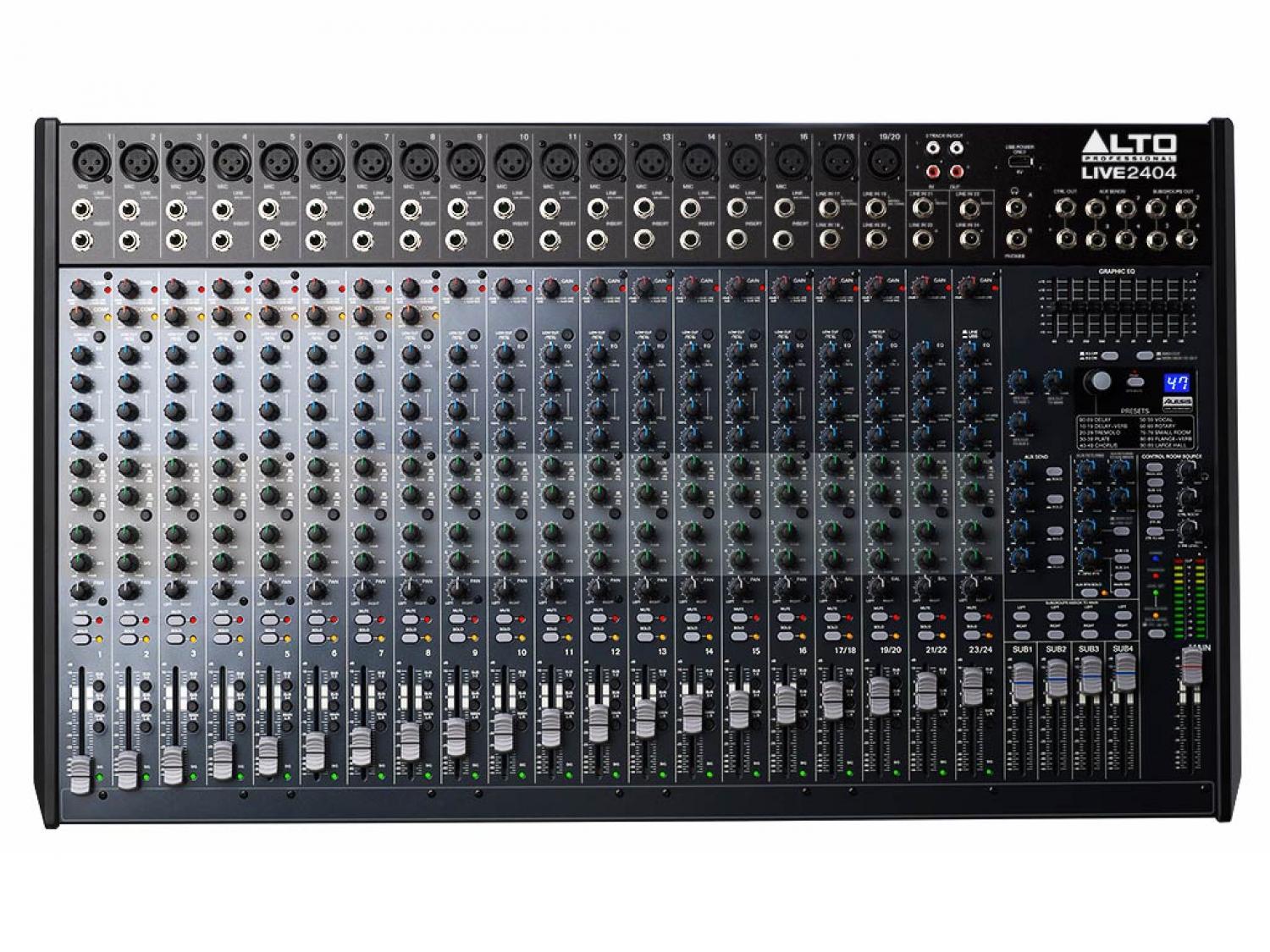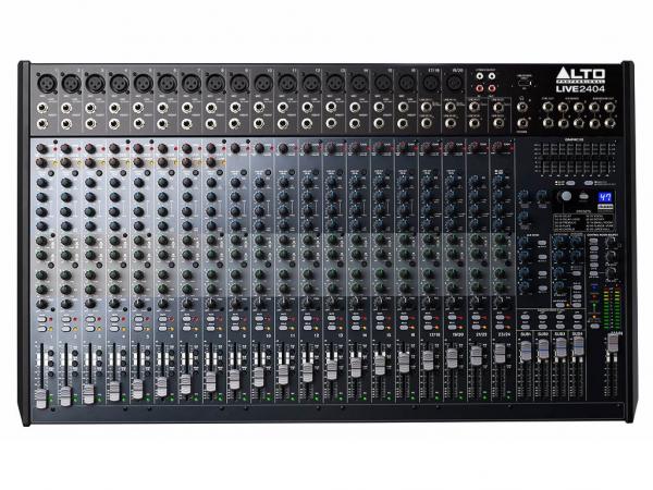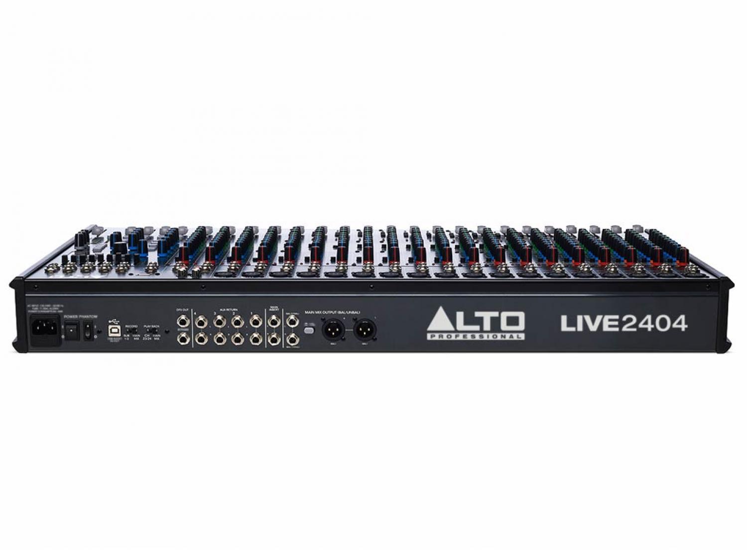 Il 2404 è il mixer di punta della serie Live prodotta dalla Alto Professional. Live 2404 è fornito di 20 canali, di cui 16 mono con ingressi XLR microfonici e Line (Jack da 1/4") sui quali troviamo la connessione insert per il collegamento di processori di segnale o multieffetti esterni, oltre ad un compressore individuale integrato solo sui primi otto. 2 canali stereo (17/18 e 19/20) con ingressi Jack (L e R) da 1/4" sono eventualmente usufruibili come canali mic mono addizionali vista la presenza del connettore XLR microfonico. Il cospicuo numero di canali del mixer Alto Professional Live 2404 si chiude con altri due stereo (21/22 e 23/24) dotati solamente di ingressi L/R Jack da 1/4". I channel strip di ogni canale forniscono, oltre al fader da 60mm: controllo di guadagno, interruttore passa alte (solo laddove è presente ingresso XLR), equalizzatore a 3 bande con medi sweep sui canali mono e 4 bande (bassi, medio bassi, medio alte e alte) su quelli stereo, pan, le quattro mandate, dedicate alle uscite ausiliarie (Aux Send) e al multi-effetto integrato, e i pulsanti mute e solo. Sui primi 8 canali è presente il controllo rotativo per l'applicazione del compressore. Per tutte le mandate, sulla destra del mixer vi è il rispettivo potenziometro rotativo per il controllo del ritorno. Il mixer fornisce 4 sub-gruppi (BUS).