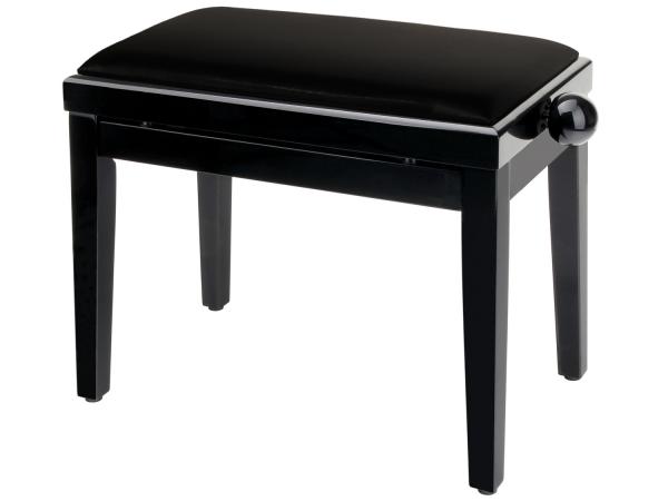 Panchetta professionale regolabile in legno per pianoforte ed organo. E' dotata di seduta imbottita con rivestimento in similpelle, meccanica in acciaio zincato nero, e di comode manopole per la regolazione dell'altezza. Il telaio è nero lucido.