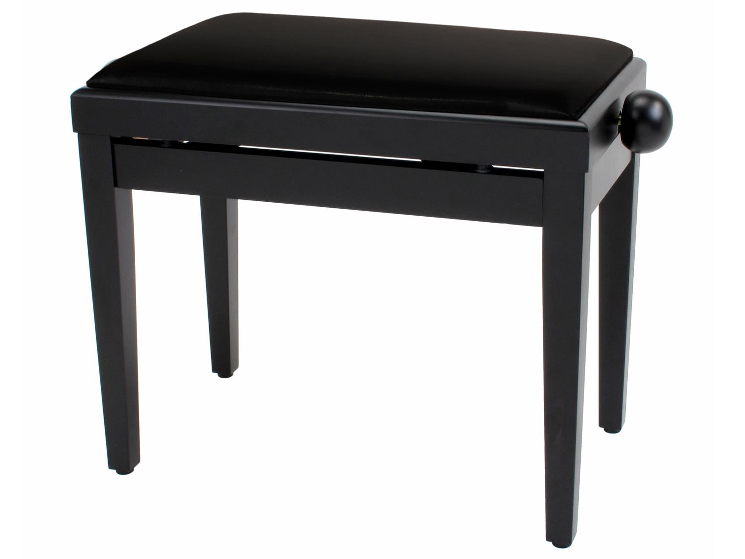 Panchetta professionale regolabile in legno per pianoforte ed organo. E' dotata di seduta imbottita con rivestimento in similpelle, meccanica in acciaio zincato nero, e di comode manopole per la regolazione dell'altezza. Il telaio è nero opaco.