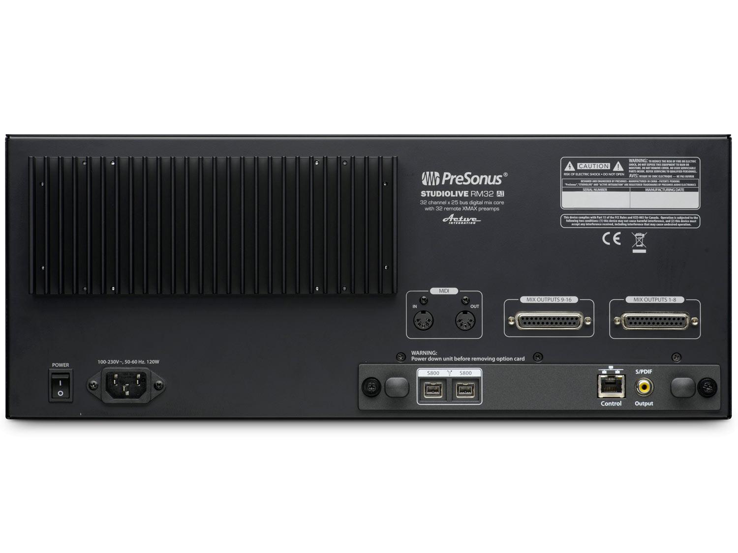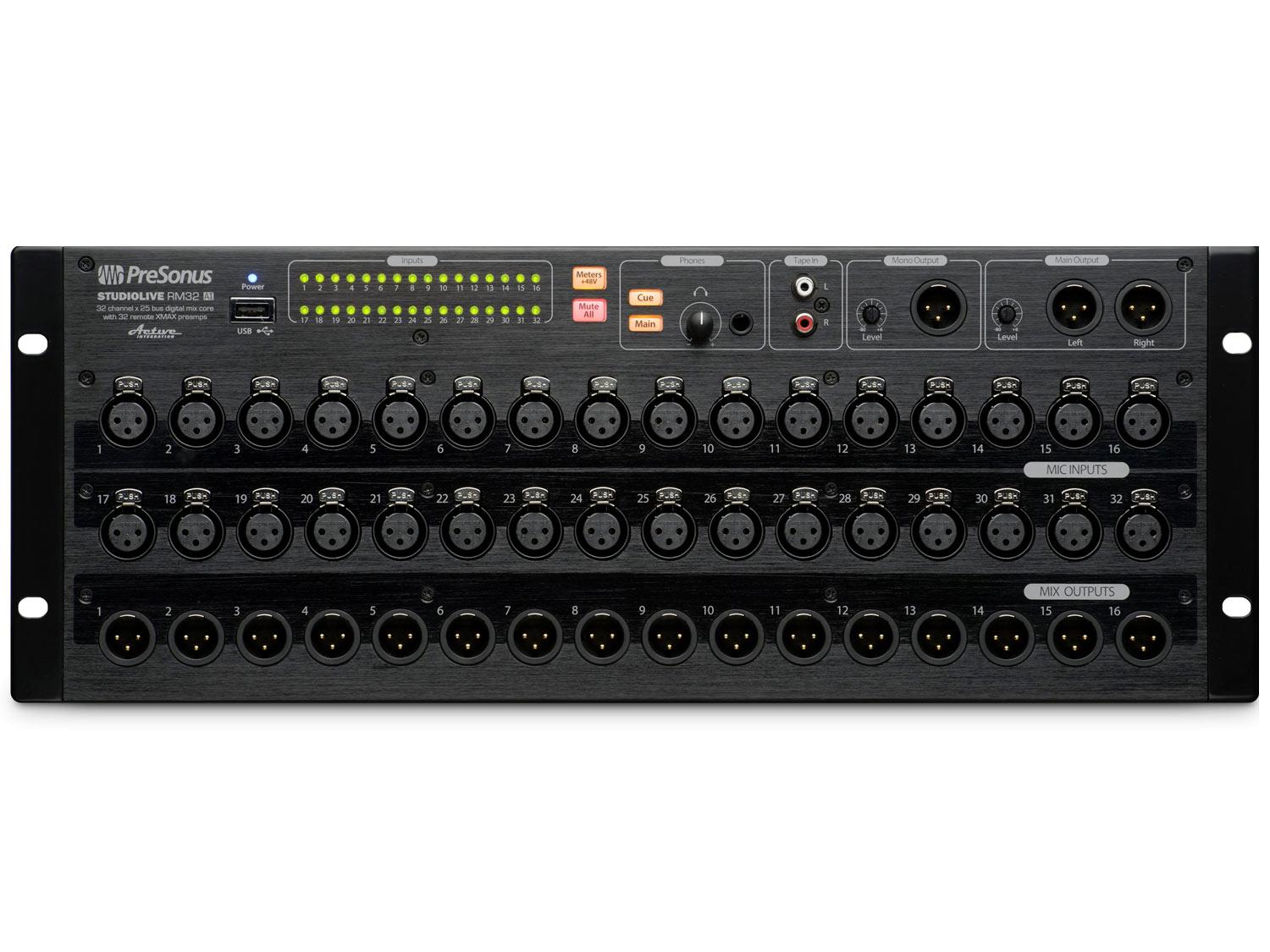 Basato sul motore della serie StudioLive AI e controllato dal potente touch-software UC-Surface per Mac, Windows e iOS, il mixer digitale a rack StudioLive RM32AI è scalabile e compatto. Fornisce 32 ingressi con preamplificatori richiamabili XMAX in Classe A, 16 uscite di linea e 3 uscite principali (left, right e mono/center), 32 canali interni e 25 Bus, una interfaccia di registrazione 52x34 FireWire 800, un funzionamento a 96 kHz ed una ampia elaborazione del segnale. Progettato per il mixaggio del suono dal vivo e le registrazioni in studio, la tecnologia Active Integration dell'RM32AI include il networking Wi-Fi ed Ethernet ed i software di registrazione, strettamente integrati all'hardware, Capture con la modalità Virtual Soundcheck, Studio One Artist DAW per Mac/Windows ed un account Nimbit per la promozione e la distribuzione di musica online.
