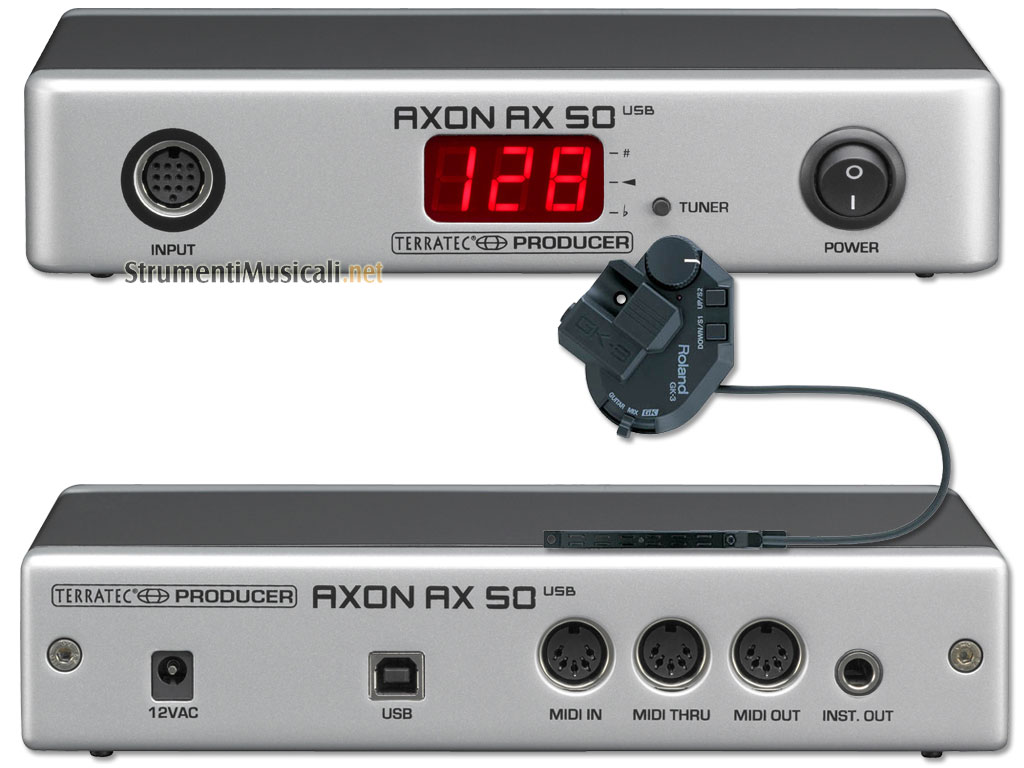 AXON AX 50 USB, finalmente è arrivato. Il controller inserito in un box di alluminio, utile anche per scopi mobile, racchiude tutta la stessa tecnologia e sistema intelligente “ neural net “ del suo popolare fratello maggiore AXON AX 100, con un opzione addizionale in più : l'interfaccia USB con 4 porte MIDI virtuali. La gestione dei suoni può essere effettuato via MIDI OUT pilotando altri strumenti hardware, o tramite le 4 porte MIDI virtuali via USB.per pilotare i suoni su piattaforma software sul vostro computer e rendendo così AX 50 ottimo per applicazioni computer-based studios. Incluso, trovate un DVD con l'ottimo software KONTAKT Player di Native Instruments " WAVE XTABLE V1 " compatibile Windows/MAC OS, per offrirvi immediatamente 128 suoni professionali, in modo da poter cominciare subito a suonare e ad apprezzare la velocità con cui il processore RISC a 32 bit garantisce una veloce trasduzione delle vibrazioni delle corde della vostra chitarra. L'editor TerraTec incluso, garantisce da subito la gestione semplice e completa di tutti i parametri di configurazionei dell'AXON AX 50.