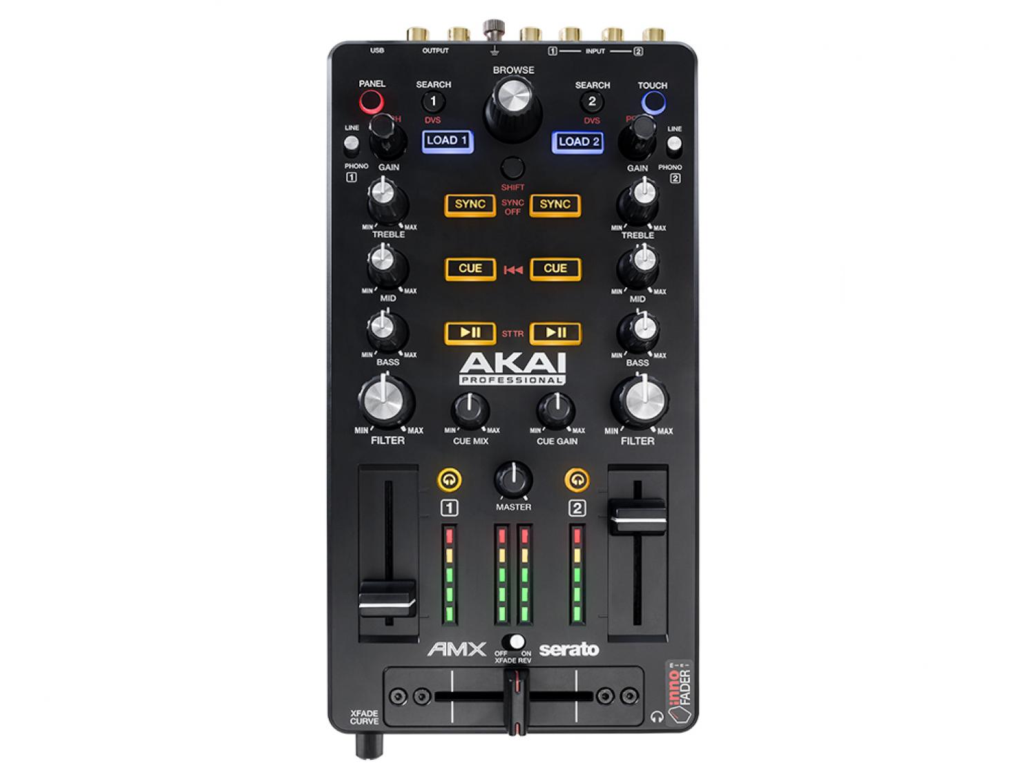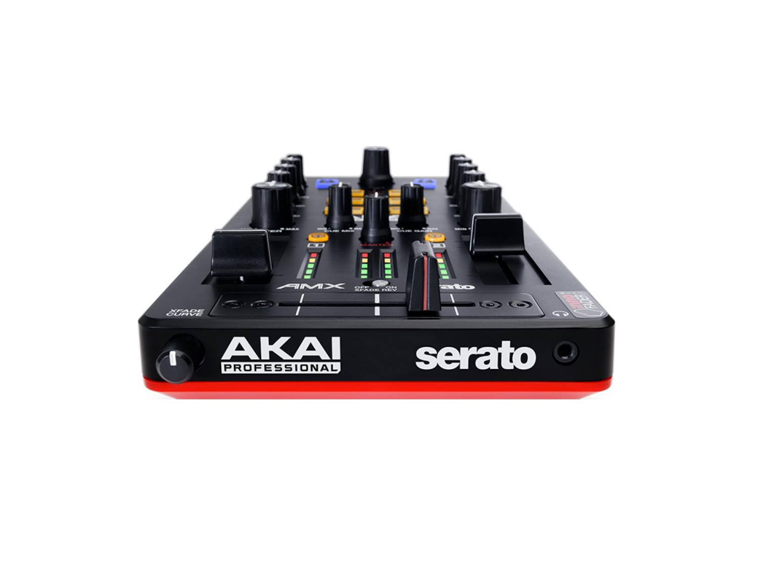 Akai Professional AMX è una superficie di controllo MIDI USB per Serato DJ, basata su un layout a due canali ed è equipaggiata con un'interfaccia audio a 24-bit/96kHz, con 2In e 2Out Stereo su connettori RCA, e rispondente alle specifiche Serato NoiseMap per l'uso con vinili timecode. La sezione di controllo offre, in un prodotto dall'ingombro limitato, tutto ciò che serve per gestire fisicamente le funzioni di mixaggio integrate in due deck/canali del software Serato DJ: fader verticale per il controllo del volume, filtro ed EQ 3 bande. Non mancano i controlli per la ricerca e il caricamento delle tracce, i tasti cue (preascolto), record e sync. Peculiarità dell'AMX è la presenza di un mini crossfader progettato da innoFADER che, nonostante le dimensioni, è ottimizzato per lo scratch e dotato di regolazione della curva di dissolvenza e funzione reverse (in gergo hamster style). La presenza dell'interfaccia audio, quindi di un'uscita cuffia e una master stereo RCA separate, permette di usare l'AMX affiancandolo a lettori CD supportati da Serato che operino in modalità HID. In più, grazie agli ingressi audio RCA phono/line presenti nel pannello posteriore, sarà possibile collegare all'AMX lettori CD e giradischi al solo scopo di utilizzarli - previo acquisto del Serato DVS Expansion Pack e dei dischi time code (non inclusi) - come controller fisici per i deck del software Serato DJ. Anche l'AMX gode dell'innovativa funzione "touch", che apre a nuovi ed interessanti modi di gestire le dotazioni del software usando contemporaneamente, oppure separatamente, la funzione rotativa e quella touch (tocco sulla superficie in alluminio del knob) dei potenziometri di filtro ed EQ. Akai AMX è un MIDI controller con interfaccia audio USB per Serato DJ. Non è un mixer audio, pertanto il segnale audio viene processato internamente dal software installato sul computer.