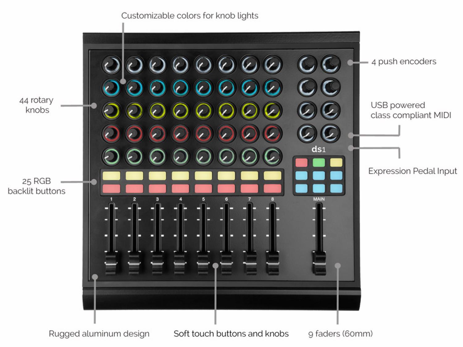 Il mixer MIDI Ds1 è una soluzione portatile per il missaggio, la produzione e le prestazioni computer-based, costruito solo con componenti e materiali di altissima qualità. DS1 introduce il controllo MIDI al familiare layout di un mixer audio analogico, ed espande le possibilità creative del routing dei segnali e dell'elaborazione del suono utilizzando workstation audio digitali. E' il tuo controller dedicato per l'accesso immediato a mix, effetti e parametri dello strumento. Il DS1 funziona semplicemente con qualsiasi software che supporti il protocollo MIDI. I template sono disponibili per workstation audio digitali popolari come Ableton Live, Bitwig Studio, Logic e molto altro. Che si stia mixando in studio, sul palco, o in viaggio il DS1 è stato progettato per adattarsi al tuo stile di vita ed al tuo setup.