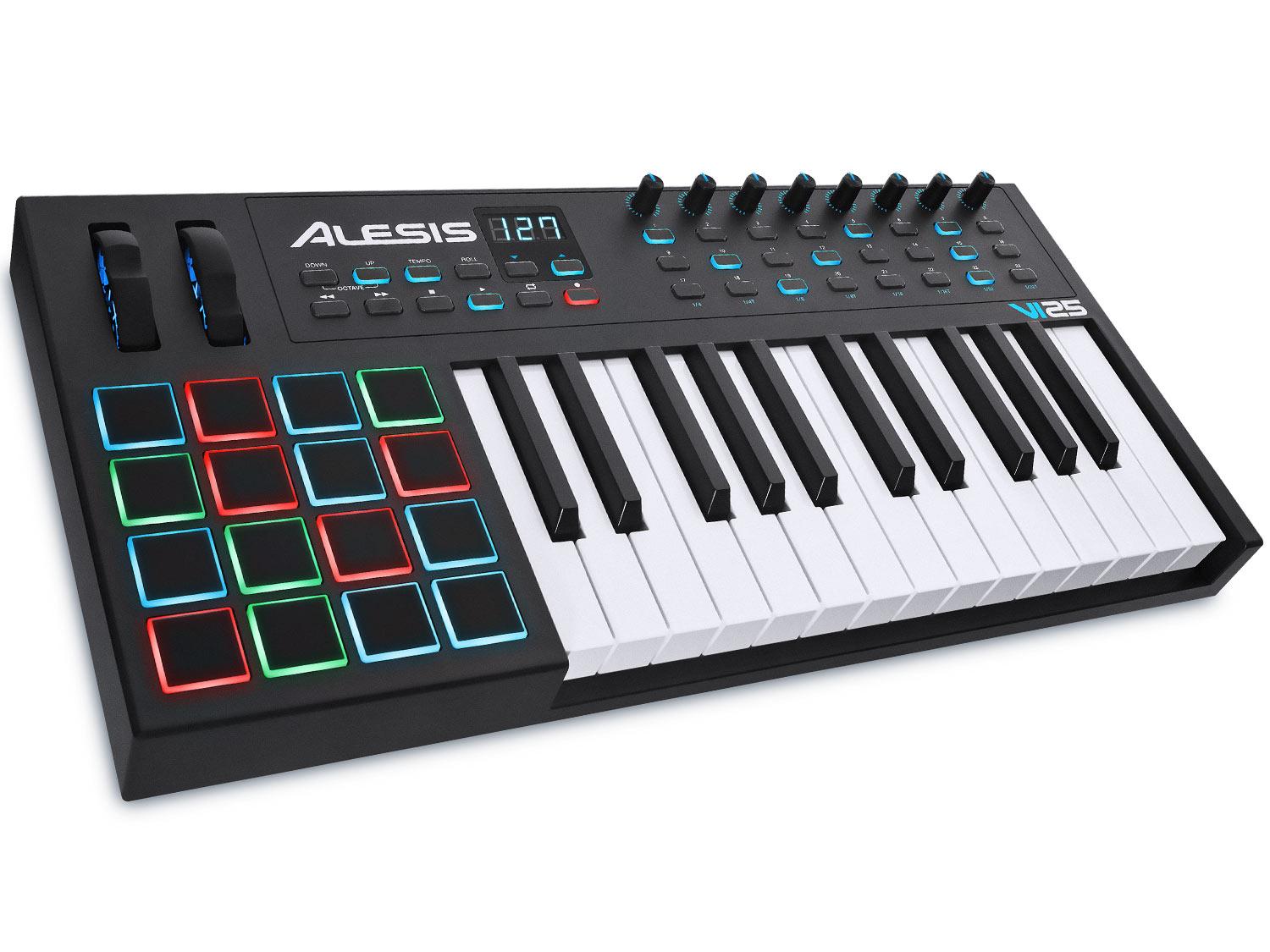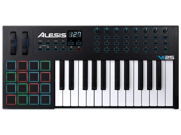 L'Alesis VI25 è una tastiera MIDI/USB a 25 tasti (2 ottave), con 16 pad, 8 potenziometri e 24 pulsanti. Dispone di una tastiera semipesata sensibile alla velocity e all'aftertouch e dispongono di ben 16 pad retroilluminati multicolore (RGB), anch'essi sensibili a pressione (aftertouch) e dinamica (velocity). Tra gli altri controlli troviamo i pulsanti per la trasposizione delle ottave, pitch bend e modulation wheel, 6 tasti per il controllo del trasposto nelle DAW e la presa per il collegamento di un pedale sustain (opzionale). Tanti i potenziometri rotativi MIDI presenti nelle tastiere della serie VI, ognuno dei quali è affiancato da ben 3 pulsanti che inviano messaggi del protocollo MIDI. Oltre alla porta USB, che funge da collegamento MIDI e alimentazione quando si collegano a computer PC e Apple e a device iOS di ultima generazione, nel pannello posteriore delle tastiere della serie Alesis VI troviamo l'uscita MIDI formato DIN e la presa per un eventuale alimentatore di corrente opzionale per l'utilizzo stand alone, utile quando vogliamo usare le tastiere per controllare sintetizzatori, drum machine, campionatori ed expander MIDI hardware.