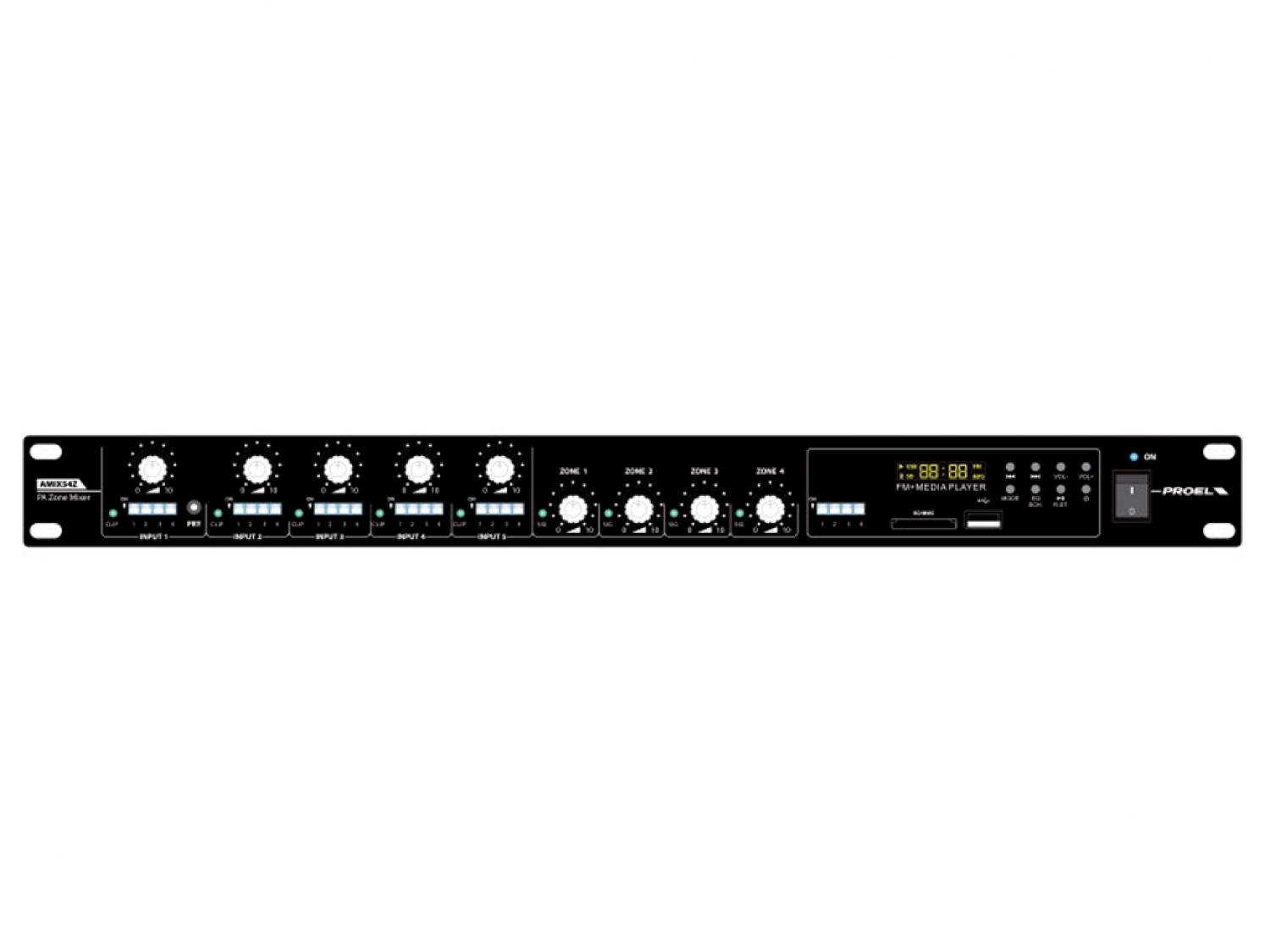 L'AMIX5Z è una Matrice/Mixer Stereo provvista di 5 ingressi linea/micro con Phantom + 48V selezionabile. Ogni ingresso è liberamente assegnabile su una o gruppi di zone, l'ingresso 1 è anche dotato della funzione di priorità su tutti gli altri ingressi, tale funzione è inseribile mediante il comodo pulsante posto sul pannello frontale. Ogni ingresso dispone di un controllo di volume posto sul pannello frontale e di un controllo del livello di sensibilità posto nel pannello posteriore che uniti al connettore XLR Combo e ai due RCA (Stereo) permettono di collegare a questo dispositivo, qualunque sorgente sonora sia essa a livello linea che micro. L'AMIX54Z è provvisto 4 uscite di zona Stereo su morsetti Eurobloc, ogni uscita dispone del proprio controllo di volume così da garantire il perfetto bilanciamento dei volumi con qualunque assetto di sorgenti audio collegate. Mediante il dip-switch posteriore ogni uscita può essere impostata su Mono o Stereo rendendo il dispositivo estremamente versatile sia in applicazioni puramente PA che applicazioni d'intrattenimento. Il lettore multimediale MP3 con radio FM (87,5 - 108,0 MHz) integrata, liberamente indirizzabile sulle zone di uscita, rende questo prodotto completo a tutti gli effetti ed estremamente vantaggioso nella maggior parte delle applicazioni.