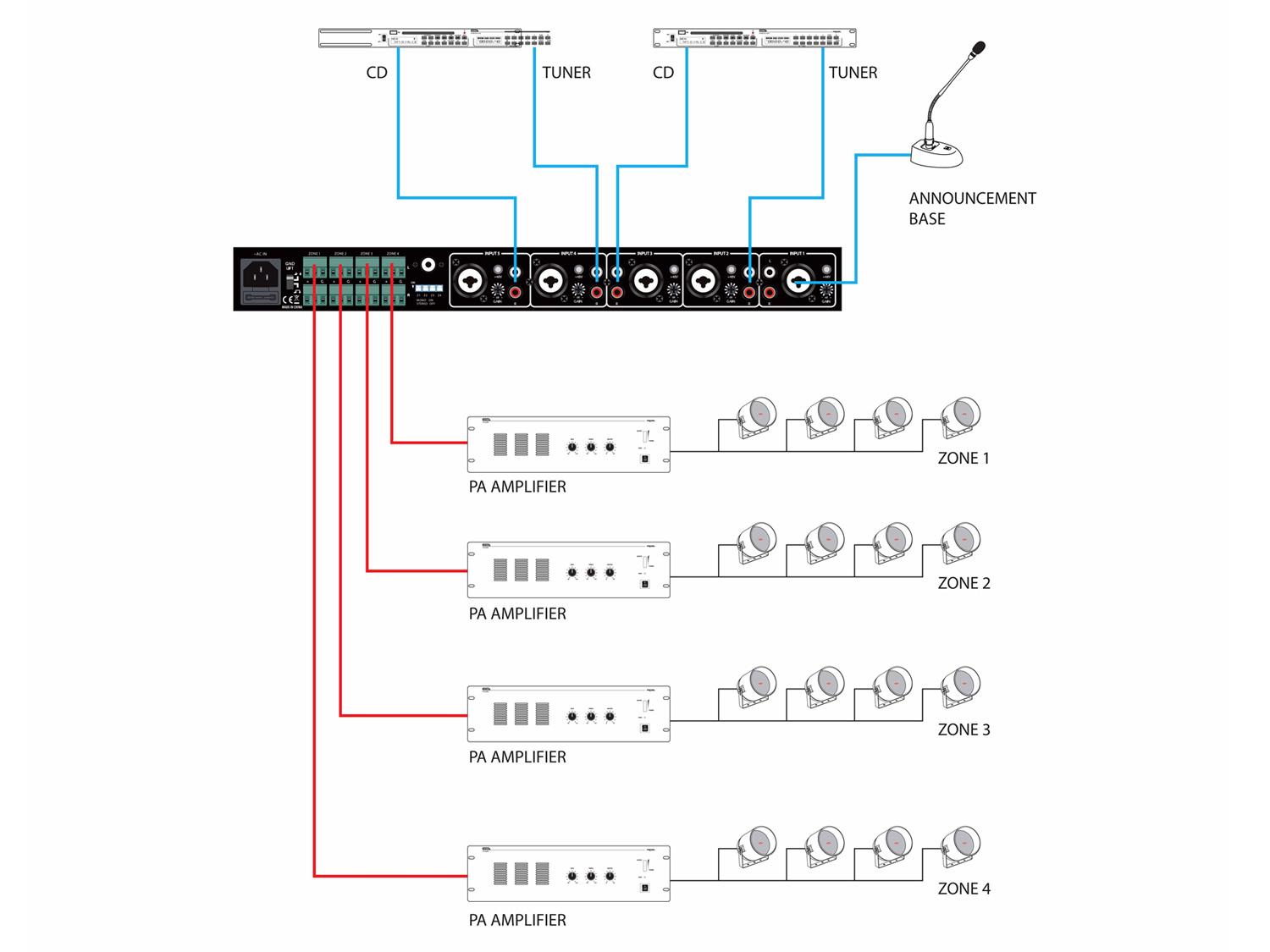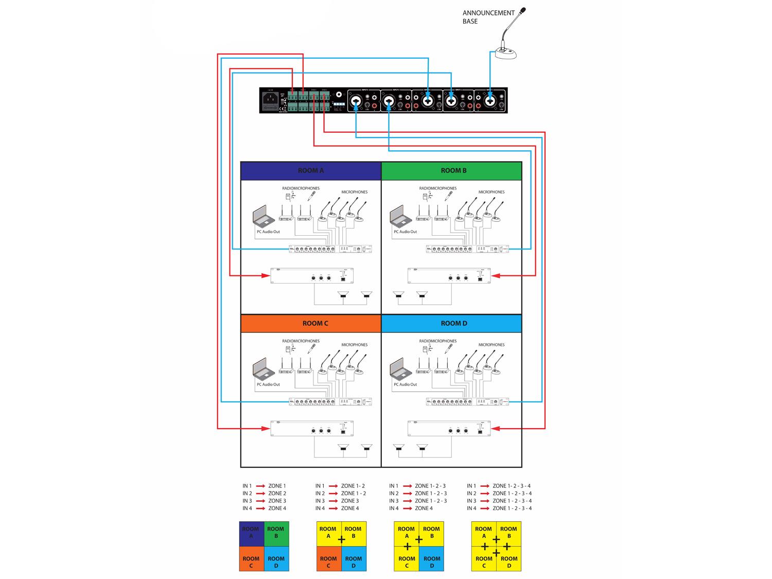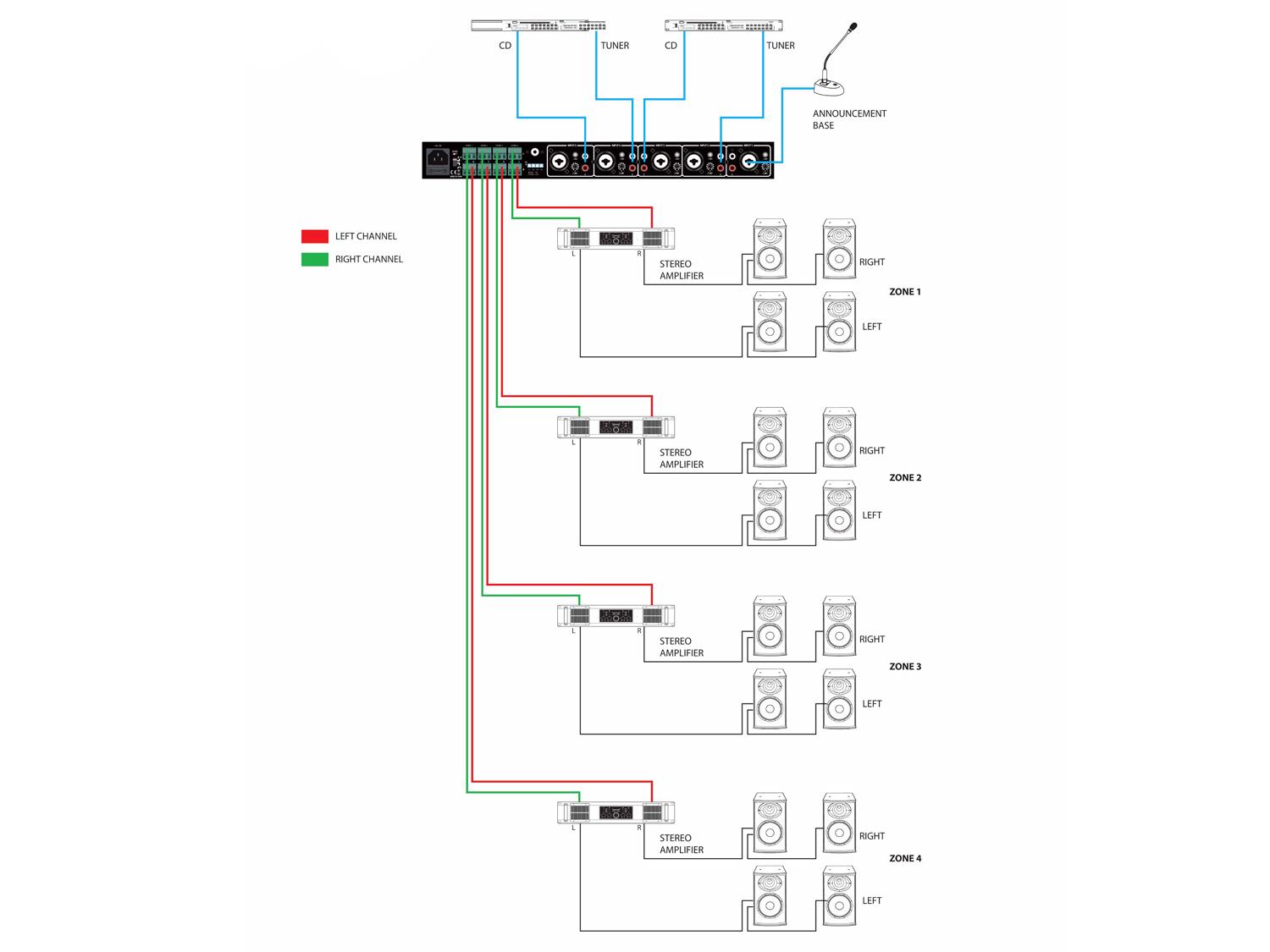 • Quatto uscite/zone stereo bilanciate su morsetti Euroblock