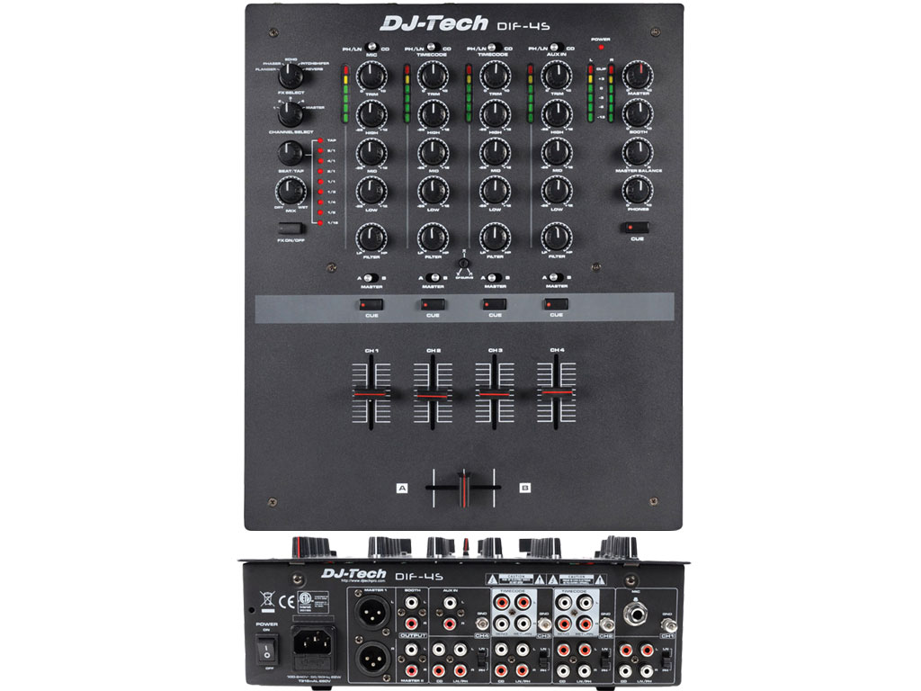 Il DJ Tech DIF-4s è un mixer per scratch-DJ professionale a 4canali con Mini Innofader integrato dal famoso produttore Audio Innovate. Ereditato dall'Innofader originale, fornisce un funzionamento regolare e robusto per gli "Scratch-Dj". Il design senza contatti fornisce una lunga vita di oltre 4.000.000 di cicli. La posizione di cut-in può essere regolata dall'utente con semplici operazioni di calibrazione per soddisfare il proprio gusto, ed il Reverse switch permette effettuare diversi stili di scratch. Il mixer è inoltre compatibile con gli Innofader originali per futuri aggiornamenti. I DIF-4s funziona da full-feature mixer a 4 canali: EQ a 3 bande, ingresso microfonico, misuratore di livello a Led per ogni canale, XLR Output, uscita cuffie 6,35mm e 3,5mm, uscita Booth con controllo del volume dedicato. Ogni canale sul DIF-4s ha il proprie EQ a 3 bande dedicato e filtri High-Pass/Low-Pass dedicati. I DIF-4s forniscono 5 effetti digitali di alta qualità.