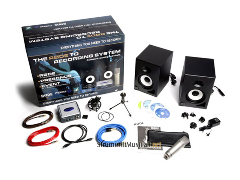 Il sistema contiene il pluripremiato RODE NT1-A (il microfono a condensatore, a diaframma largo, più silenzioso al mondo), una coppia di monitor da studio bi-amplificati EVENT ALP-5, ed una scheda AUDIO FireWire PreSonus INSPIRE. Inoltre nel bundle troverete anche i software di registrazione Steinberg Cubase LE e SONY Acid XMC ed il PRO PAK contenente plug-in e campioni.