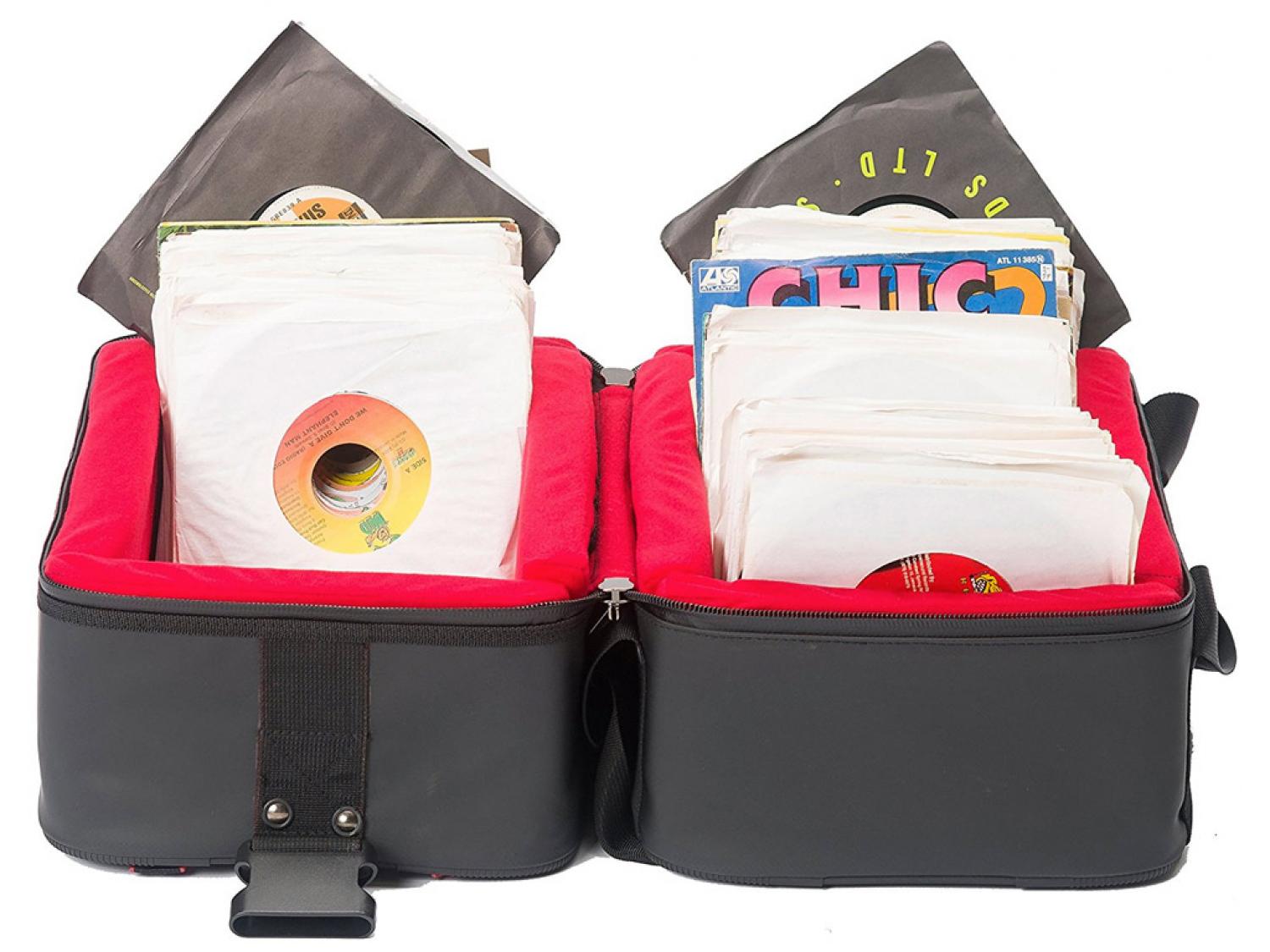 La Riot 45 Record Bag Large si rivolge alle esigenze dei DJ professionisti che usano vinili ed agli appassionati di 45 giri che hanno bisogno di portare i loro dischi da 7 pollici in modo sicuro, ma con comfort e stile. La borsa porta dischi semirigida ed imbottita è in grado di contenere fino a 150 dischi da 7" in vinile.