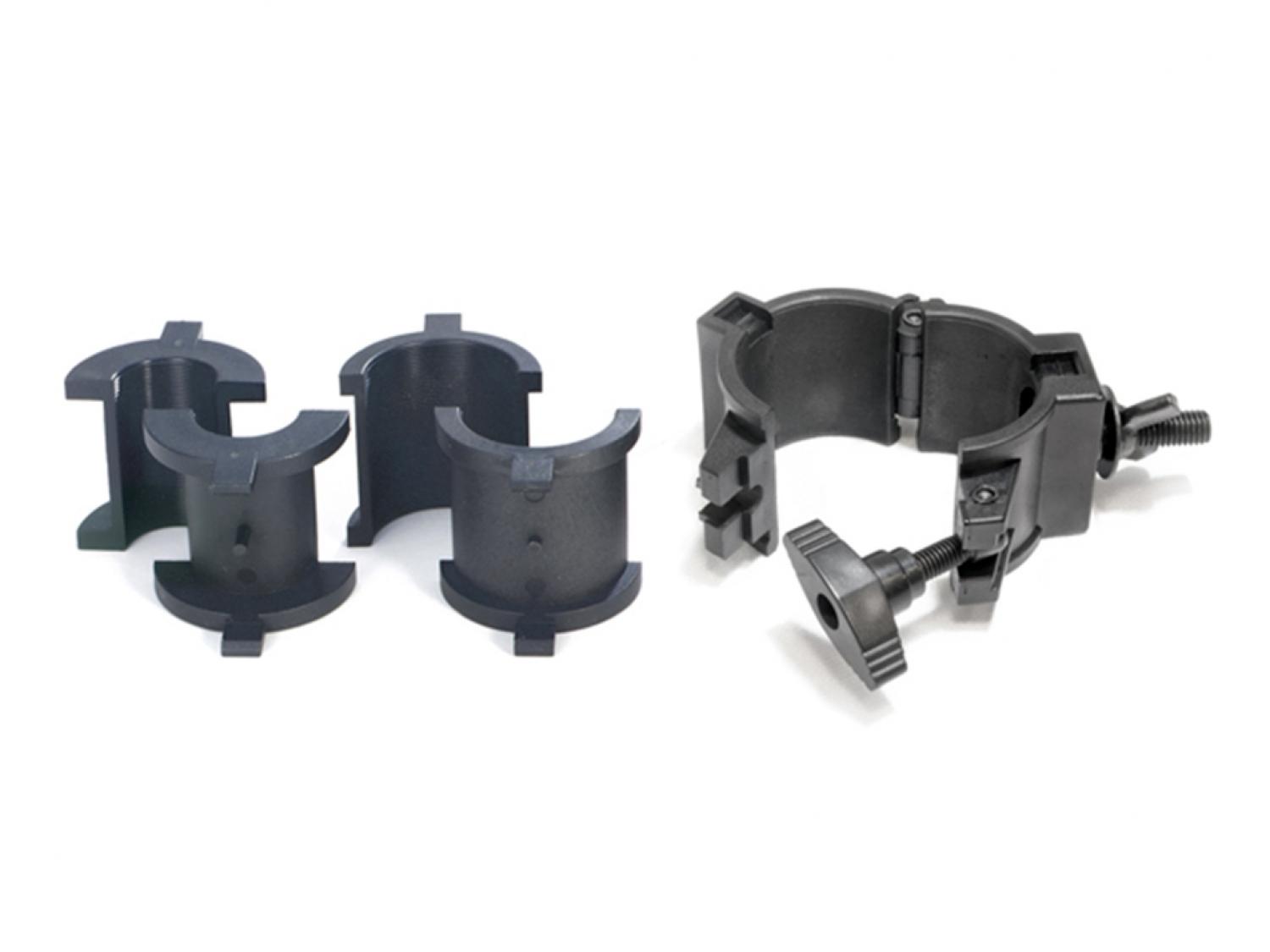 Morsetto di fissaggio in plastica ABS, con bullone M10, il CLP-10 avvolge completamente e senza rovinarli i tubolari ai quali si fissa garantendo una portata di 33kg. Grazie agli adattatori dedicati può essere fissato a tubi di diametro da 25mm, 38mm e 50mm.