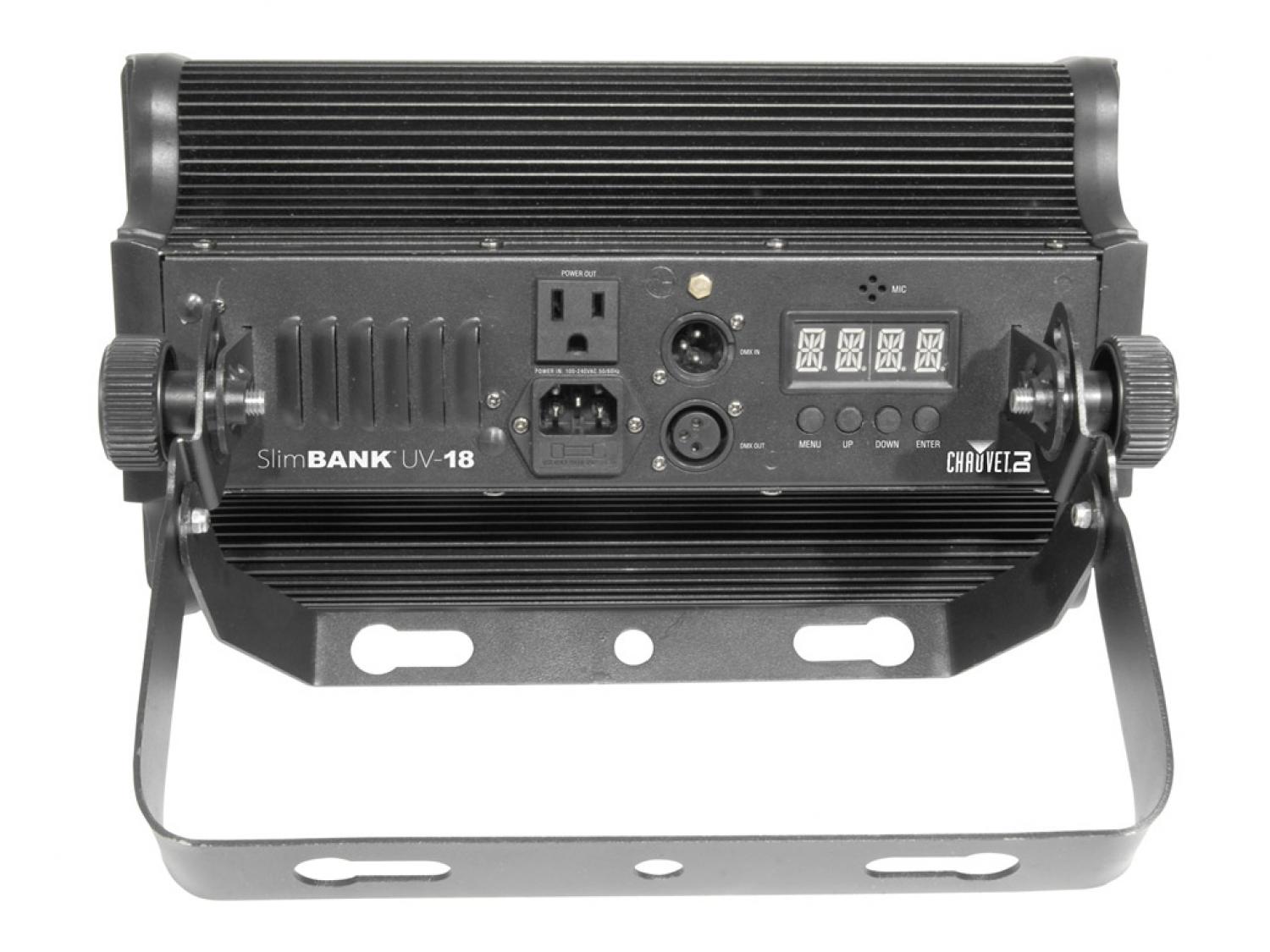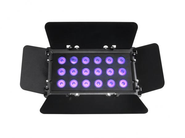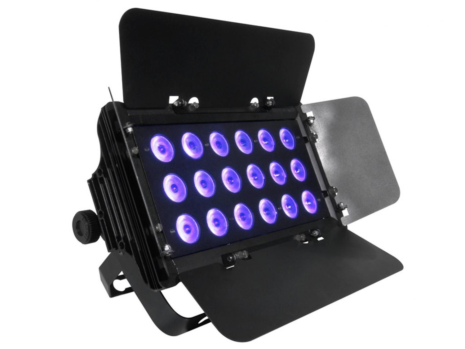 SlimBANK UV-18 è una potente lampada di Wood equipaggiata di 18 LED ultravioletti ad alta potenza dimmerabili a varie curve ed intensità, perfetto per qualsiasi installazione ed evento, dai party di Halloween ai party a tema. La direttività può essere impostata manualmente a mezzo degli appositi sportelli paraluce.