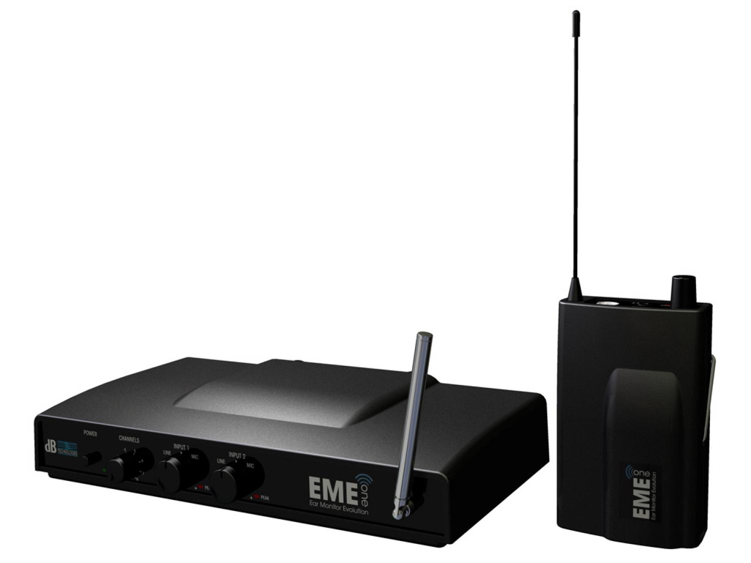 Lo scenario globale delle radiofrequenze in UHF è decisamente affollato e complesso, soprattutto per gli utilizzatori di microfoni e IEM (In Ear Monitor) wireless; le medesime frequenze sono infatti utilizzate anche dalla televisione digitale e dalla nuova generazione di strumenti per la navigazione del web. In questo contesto difficoltoso dBTechnologies segna il punto di svolta scegliendo di utilizzare la banda VHF. EME One trasmette infatti fra i 170 e i 230MHz, e può essere utilizzata sul palco contemporaneamente ad altri sistemi wireless che trasmettono in UHF senza il rischio di conflitti e interferenze. Il sistema assicura inoltre un audio di alta qualità grazie alla tecnologia innovativa Digital Code Squelch che permette di trasmettere dati codificati contemporaneamente al segnale audio. Il ricevitore "apre" l'audio semplicemente grazie a un trasmettitore codificato alla medesima frequenza: questo tipo di streaming digitale permette inoltre operazioni di accensione e spegnimento del dispositivo assolutamente silenziose. A completamento del sistema, dbTechnologies ha scelto un auricolare top quality: una versione custom del "Fire One" di Beyerdinamic in grando di offrire un SPL e una definizione del suono eccellenti.