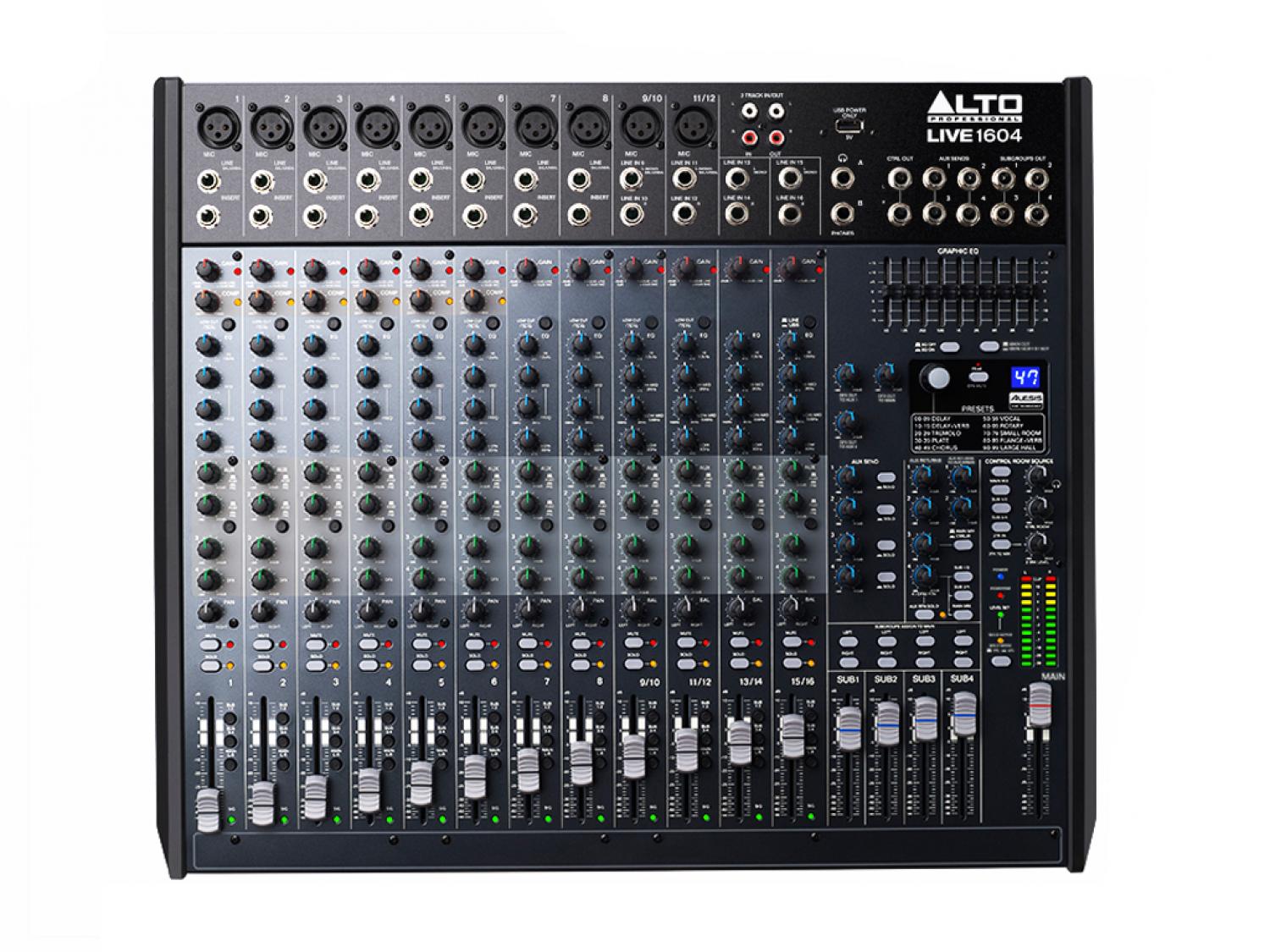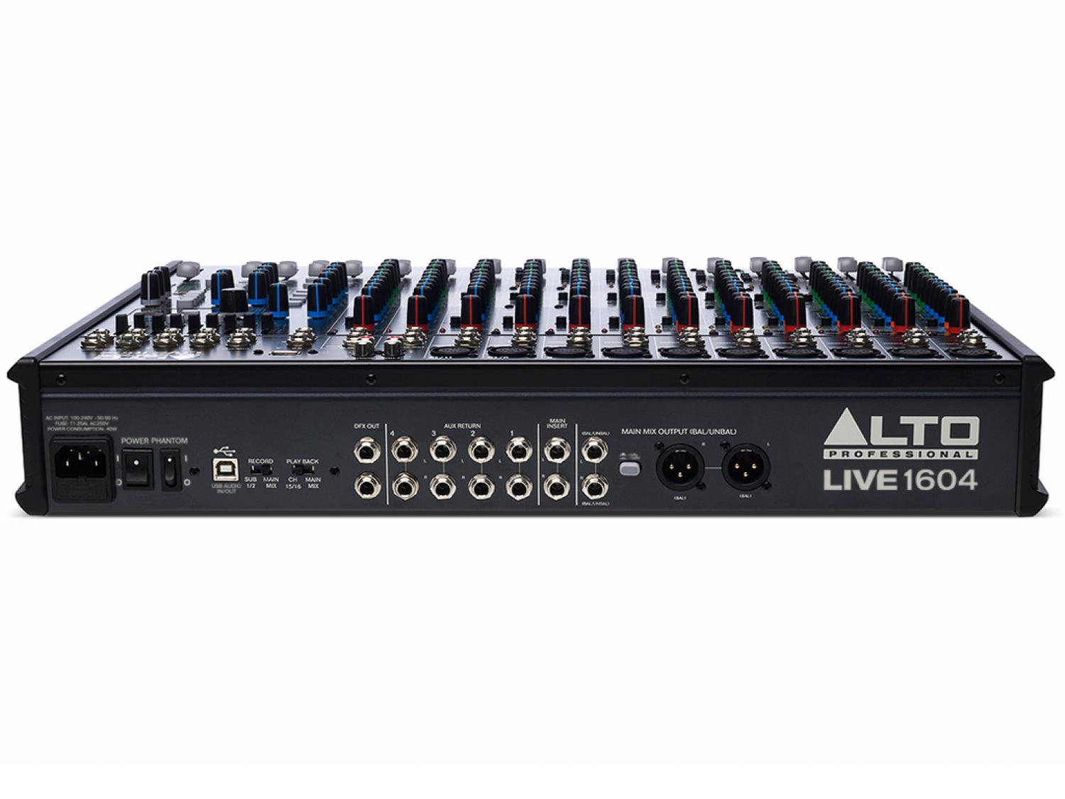 Alto Professional Live 1604 è un mixer 12 canali, di cui 8 mono con ingressi XLR microfonici e Line (Jack da 1/4") sui quali sono presenti la connessione insert per il collegamento di processori di segnale o multieffetti esterni, oltre ad un compressore individuale integrato solo sui primi 6. Due canali stereo (9/10 e 11/12) con ingressi jack (L e R) da 1/4" sono eventualmente utilizzabili come canali mic mono addizionali vista la presenza del connettore XLR microfonico. Si completa il tutto con altri due canali (13/14 e 15/16) dotati solamente di ingressi L/R jack da 1/4". I channel strip di ogni canale forniscono, oltre al fader da 6cm il controllo del gain, switch passa alte (solo dov'è presente l'ingresso XLR), equalizzatore a 3 bande con mid-sweep sui canali mono e 4 bande (bassi, medio bassi, medio alte e alte) su quelli stereo, pan e le quattro mandate dedicate alle uscite ausiliarie (Aux Send) e al multieffetto integrato, e i pulsanti mute e solo. Sui primi 6 canali è presente il controllo rotativo per l'applicazione del compressore. Per tutte le mandate, sulla destra del mixer vi è il rispettivo potenziometro rotativo per il controllo del ritorno. Il mixer fornisce 4 sub-gruppi (BUS).