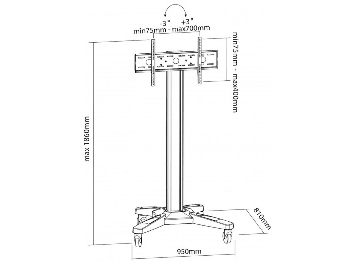 Supporto mobile per uso professionale, realizzato in acciaio e alluminio, che può sostenere LED, LCD o TV a schermo piatto fino ad 80 kg e con un range da 37" a 70" (VESA 600x400 max). Il supporto per la TV si regola facilmente con le manopole laterali e più essere posizionato fino ad un massimo di 186 cm per garantire una perfetta visualizzazione in ogni condizione di utilizzo. Provvisto di una solida base in acciaio dotata di robuste ruote con freno, per una tenuta ottimale del peso delle attrezzature ed una altrettanto facile manovrabilità. Dotato di pratici collarini per l'organizzazione dei cavi. Rappresenta una soluzione ideale per l'utilizzo in conferenze, esposizioni ed altre presentazioni professionali.