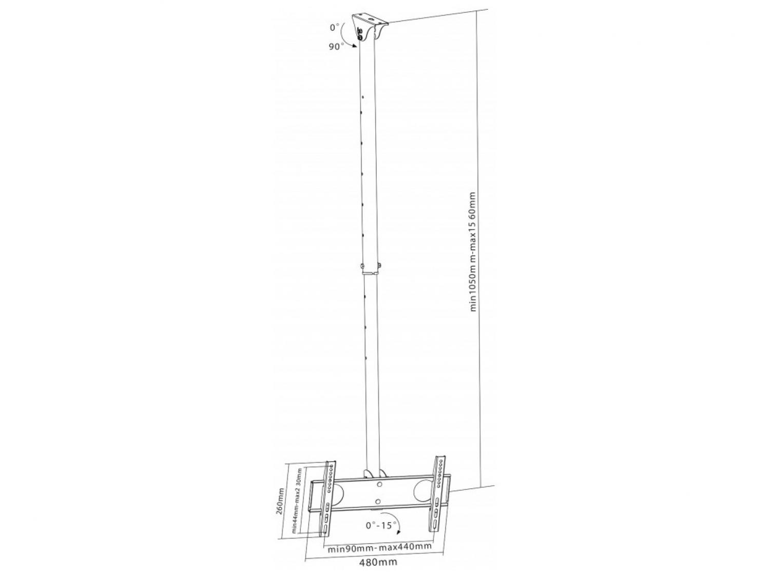 Supporto professionale universale per per il montaggio a soffitto di schermi LED, LCD o TV a schermo piatto (anche con superficie inclinata). E' la soluzione perfetta per le applicazioni retail e commerciali. Regolabile in altezza, da un minimo di 1050 ad un massimo di 1560mm in altezza per offrire massima versatilità e compatibilità d'uso. Offre un'inclinazione di 15°. Può essere utilizzato per pannelli con dimensioni in un range da 32" a 55" (VESA 400 x 200max) con un peso massimo di 50kg. Dotato di un pratico sistema per l'organizzazione dei cavi per offrire un aspetto elegante ed ordinato.