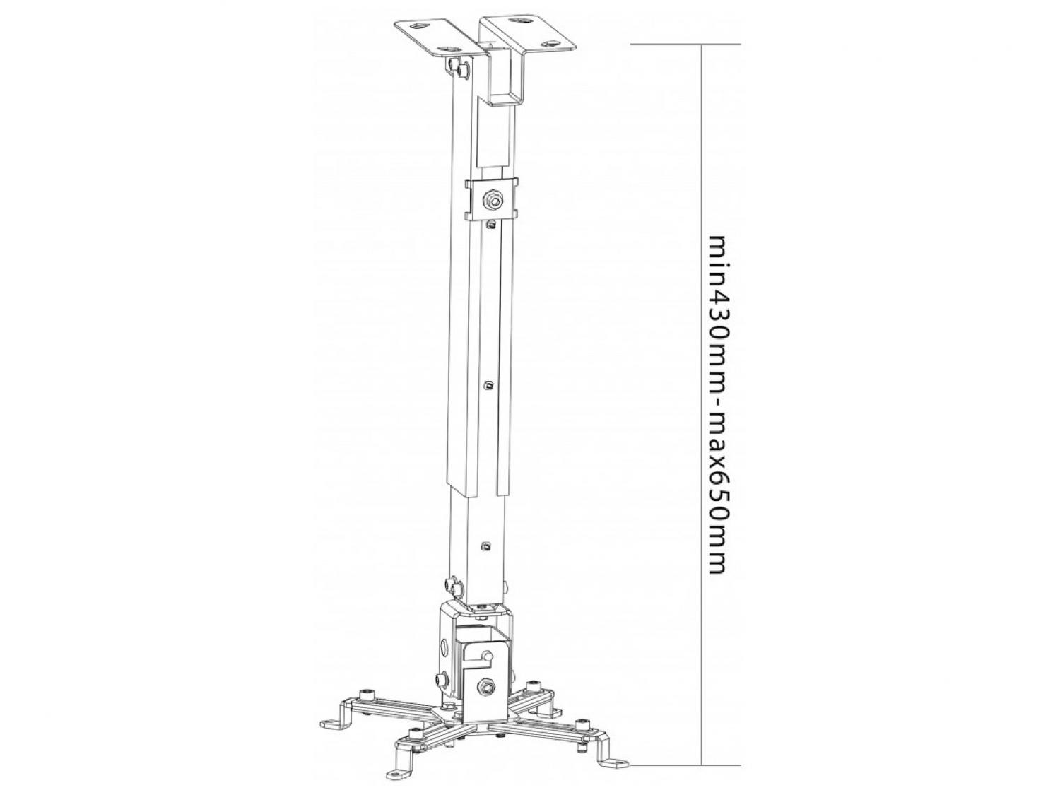 Supporto per videoproiettore da soffitto con altezza regolabile da 430mm fino ad un massimo di 650mm. Dotato di sistema integrato per l'organizzazione dei cavi è realizzato in acciaio per il montaggio a soffitto. Offre un posizionamento flessibile grazie ai quattro bracci di supporto regolabili che possono adattarsi ad una vasta gamma di proiettori grazie alla piastra di aggancio che può coprire una superficie da 225 a 316mm di diametro. Regolazione dell'inclinazione di -15° / +15° e dello snodo -8° / +8°. Il connettore a sgancio rapido consente al proiettore di essere installato / disinstallato rapidamente e facilmente per le operazioni di manutenzione, senza necessità di effettuare il riallineamento. Può essere utilizzato per proiettori con un peso massimo fino a 20 kg.