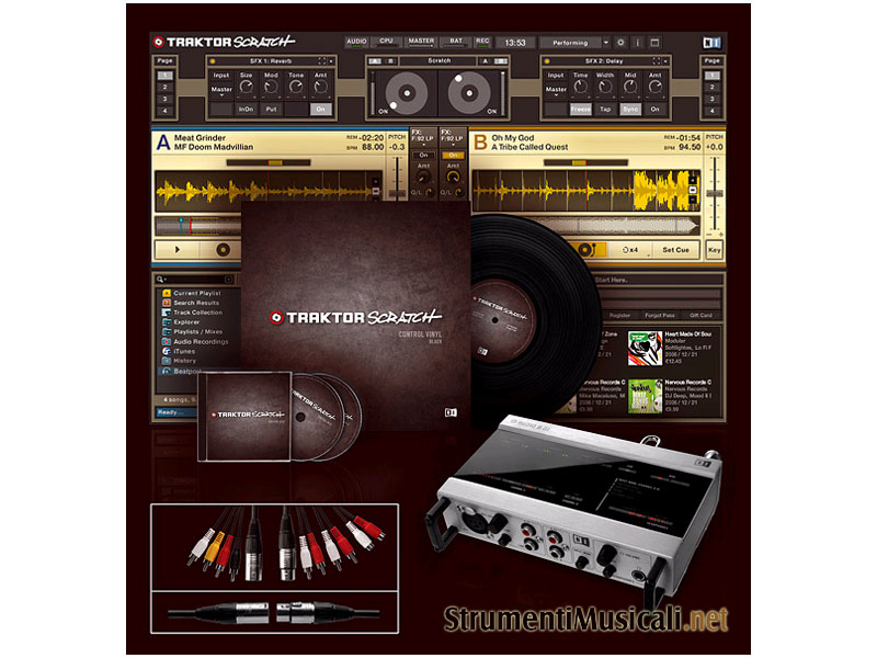 TRAKTOR SCRATCH è il DJ system professionale che vi permette di utilizzare e controllare la vostra collezione di tracce audio digitali sia utilizzando piatti tradizionali (vinile) che cd player da Dj. Il pacchetto è composto da un software semplice ed intuitivo, da particolari vinili e cd di controllo (che contengono il timecode proprietario, ovvero il linguaggio di sincronismo), due cavi multicore professionali e l'AUDIO 8 DJ, un'interfaccia audio di altissima qualità costruita appositamente per le esigenze dei DJ. Assolutamente solido ed affidabile, e grazie alle sue connessioni, anche immediatamente utilizzabile, ogni elemento di questo sistema è stato progettato dal team Native Instruments a Berlino, in Germania. Il risultato è TRAKTOR SCRATCH - il perfetto mix tra il feeling dell'analogico e la libertà e le potenzialità del digitale. Mai come ora la tecnologia ha avuto un'anima (analogica!).